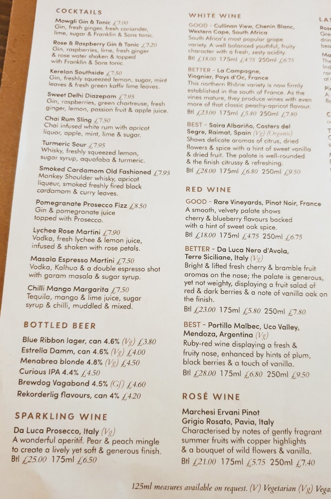 Some nice options here, to tempt me away from my usual default option of a mango lassi or chai (oddly the latter is missing from the drinks list, which was a bit disappointing as it is one of my favourite pairings with Indian food, unless that is the “Proper Ginger Tea”?).