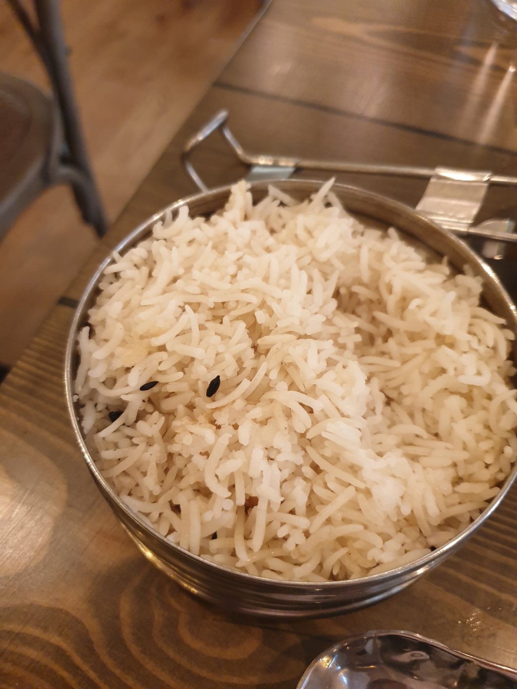 Cooked (steamed) on point with light fluffy grains and nice spicing (cumin and cardamon), it was just the job from soaking up the various sauce heavy curries.