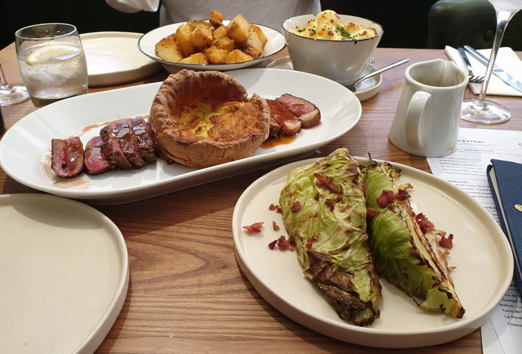with a spread including not only top quality dry aged beef, but also jamon fat roasties, chargrilled hispi cabbage with jamon, manchego infused cauli. cheese and a cecina Yorkshire pud.