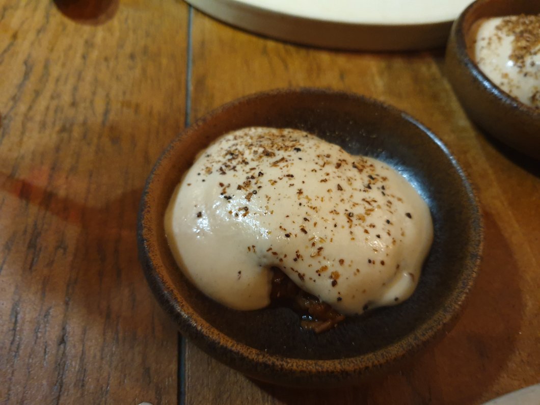 A burnt pear puree (sweet, but with just a touch of bitterness to take the edge off the sweetness) sat atop a pig’s head croquette. The crisp coating giving way to melt in the mouth pig’s head meat – this was pigginess to the max.
