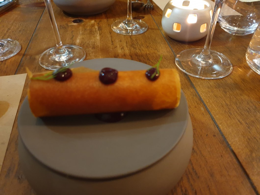 On to the puds, first up was a two tier dish. On top was a gossamer thin filled tube with dabs of burnt pear puree