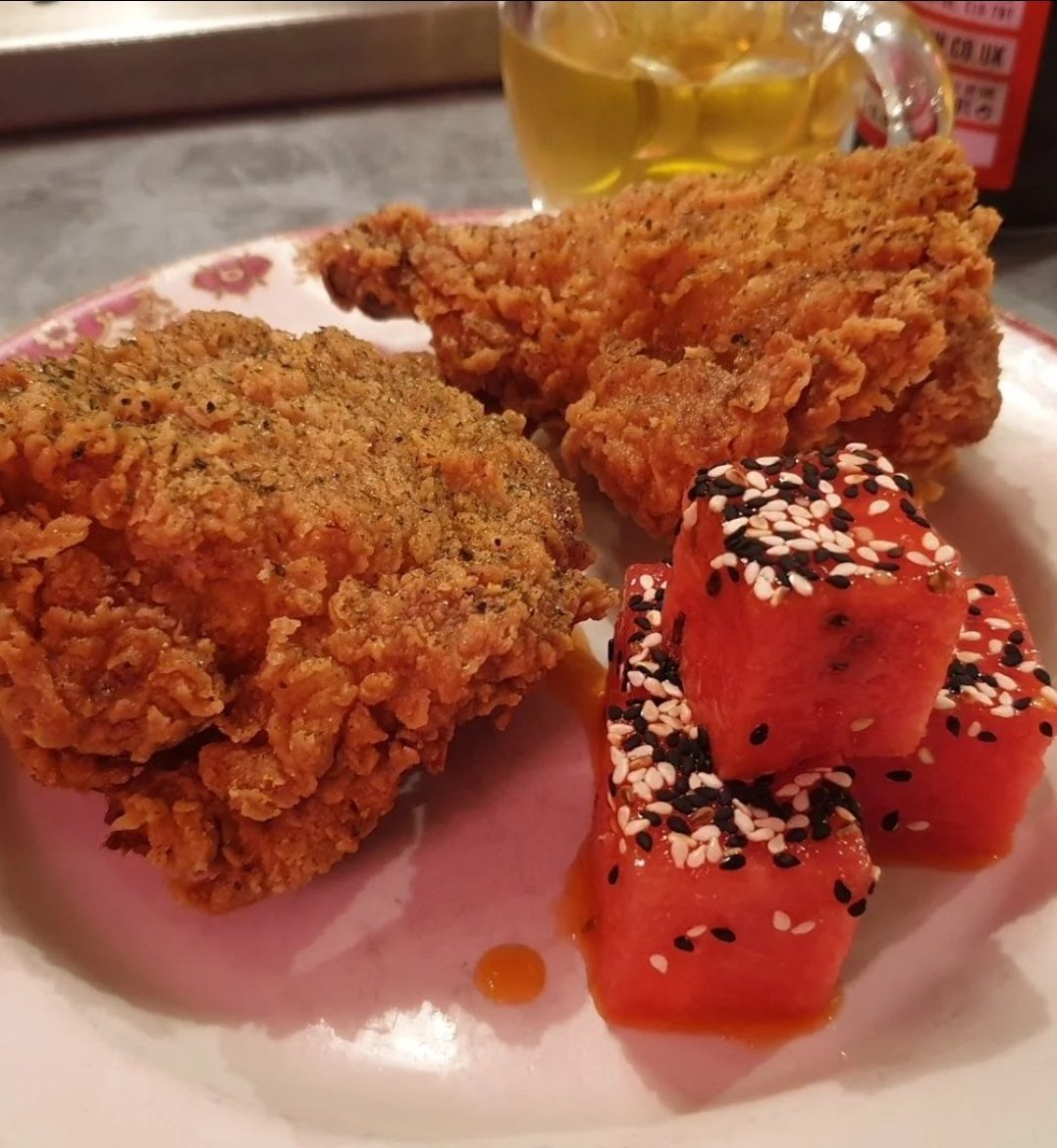 The coating on this was next level awesome, with a deeply satisfying crunch. Beautifully tender and full on flavoured chicken lay under that coating, all of which made for an exceptional fried chicken dish. The richness of the pressure cooker deep fried chicken was beautifully offset by some killer pickled watermelon.