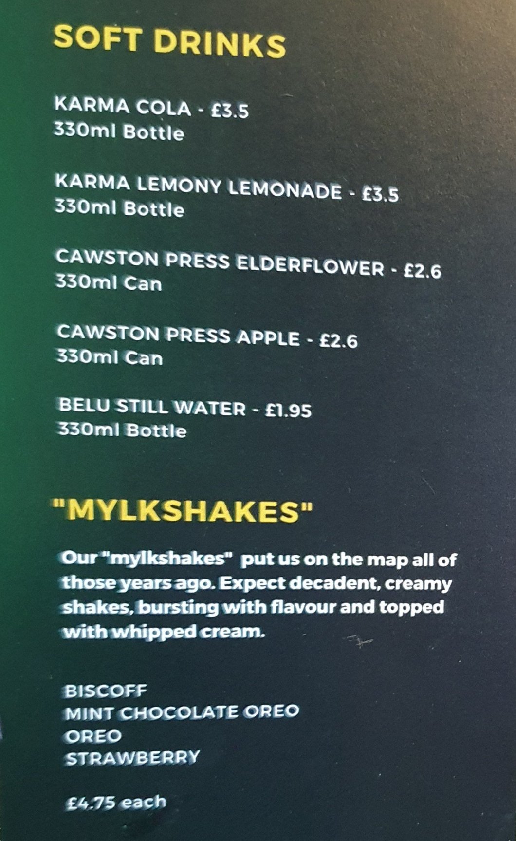 Prices (which include fries) seem to be pretty much in line with the higher end meat based burger joints (like Honest) in the City centre, ranging from £9.50 (for the hot dog and fried chick’n) to a whopping £14.50 (for a double stack burger).