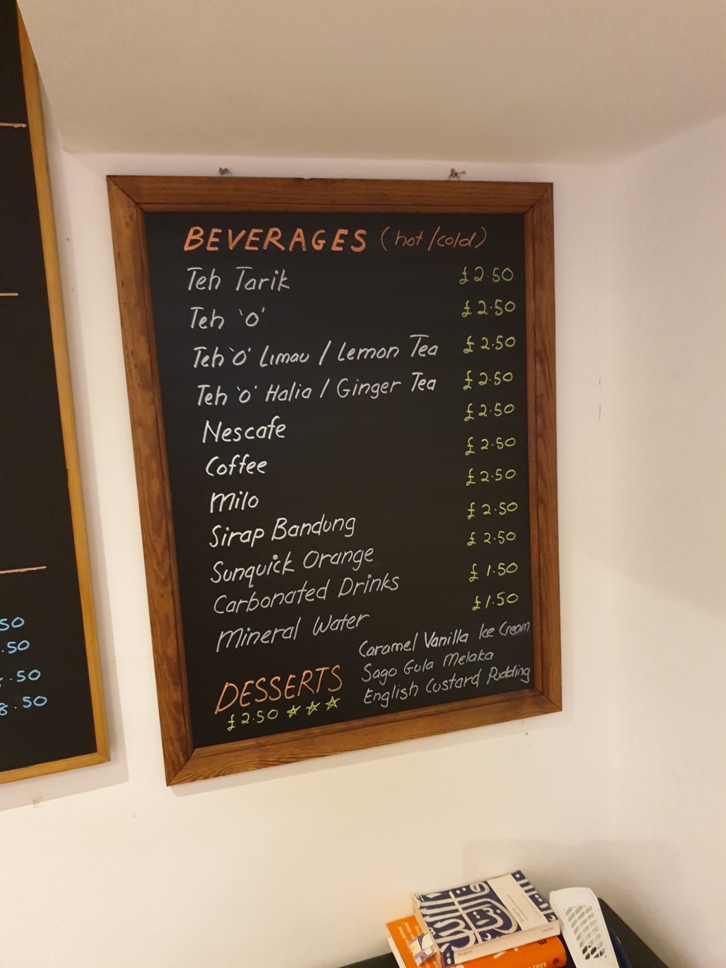 Decent selection of these, including my personal favourite teh tarik (a sweet tea made using condensed milk) for £2.50.