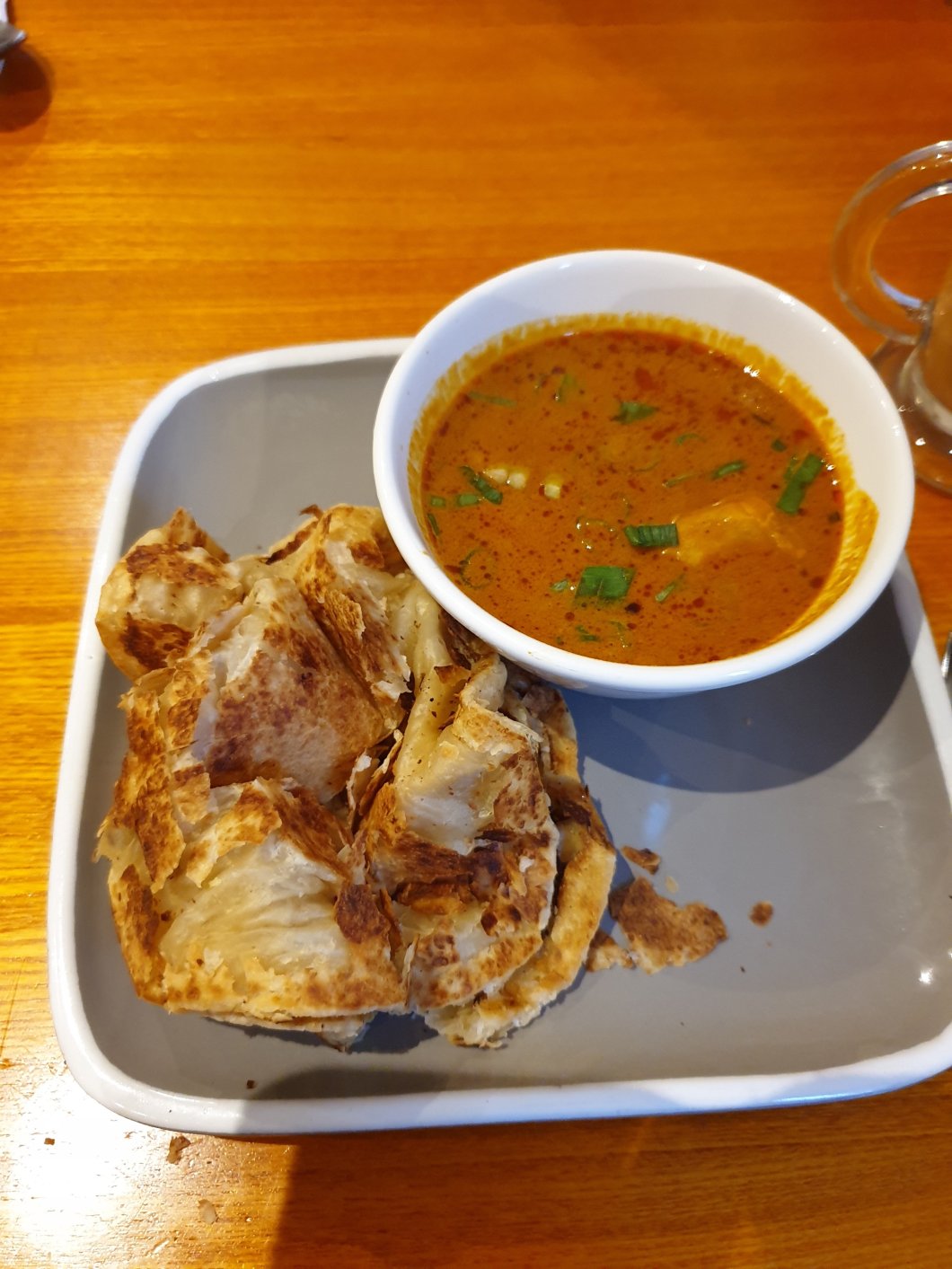 Here the two rotis had a good flakiness to them (possibly a bit to much of a good thing here) and a nice stretchy texture. Great for dipping in the chicken curry they came with.