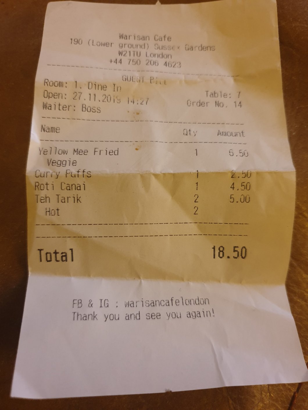 Great little hole in the wall joint, with good, nicely spiced, food. This is provided on the basis of generous portions at a very reasonable price (bargain anywhere, let alone London).