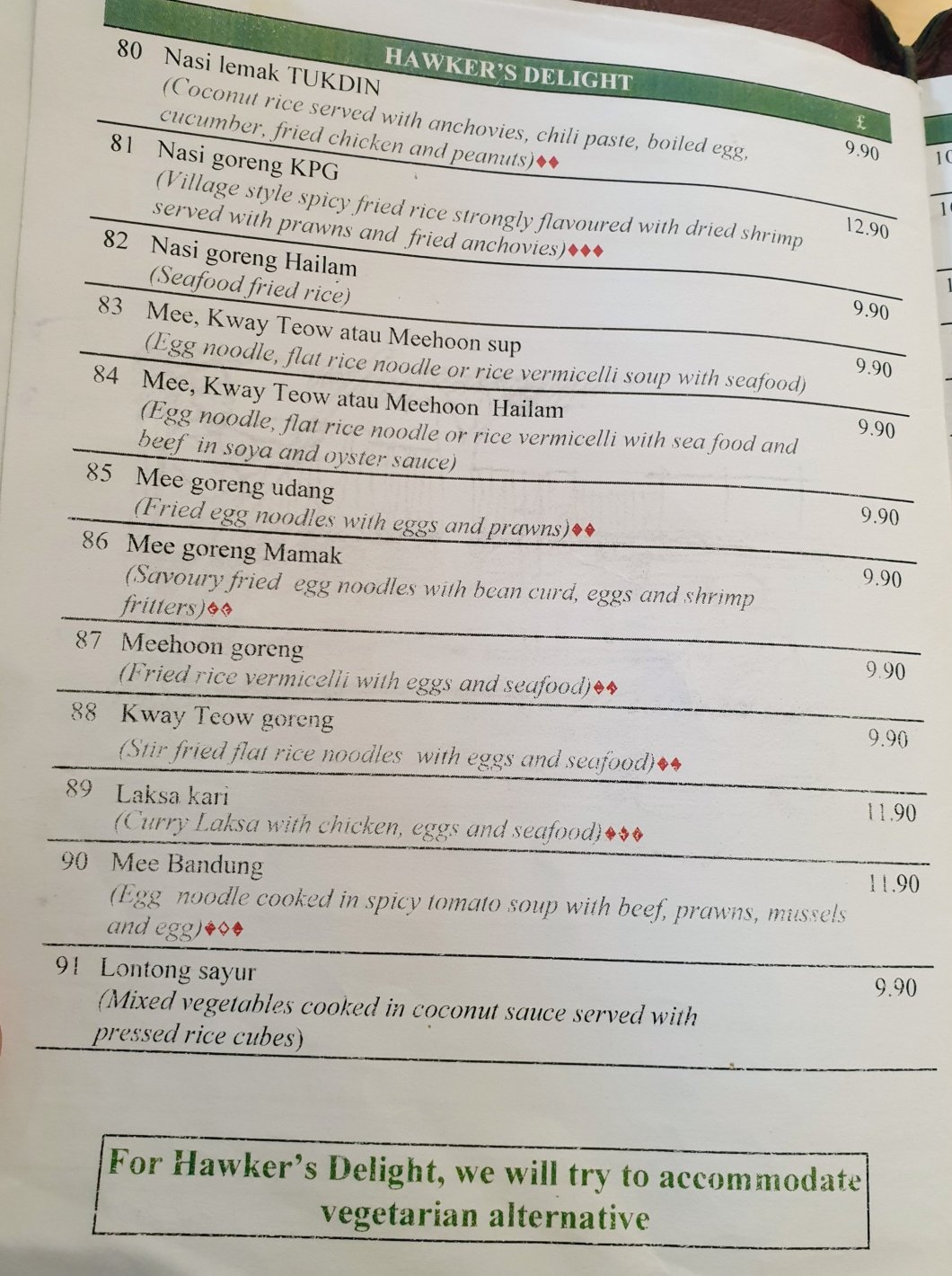 or something from the Hawker’s Delight section of the menu was in order to order.