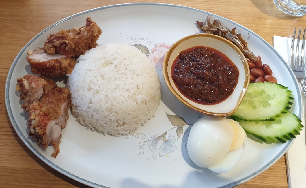 Nasi lemak comes in various forms, with the standard components of coconut rice, a sambal, peanuts, crispy anchovies, egg and cucumber often (if you are feeling posh) supplemented by a meat element. Here the meat element was fried chicken, taking the price to £9.90.