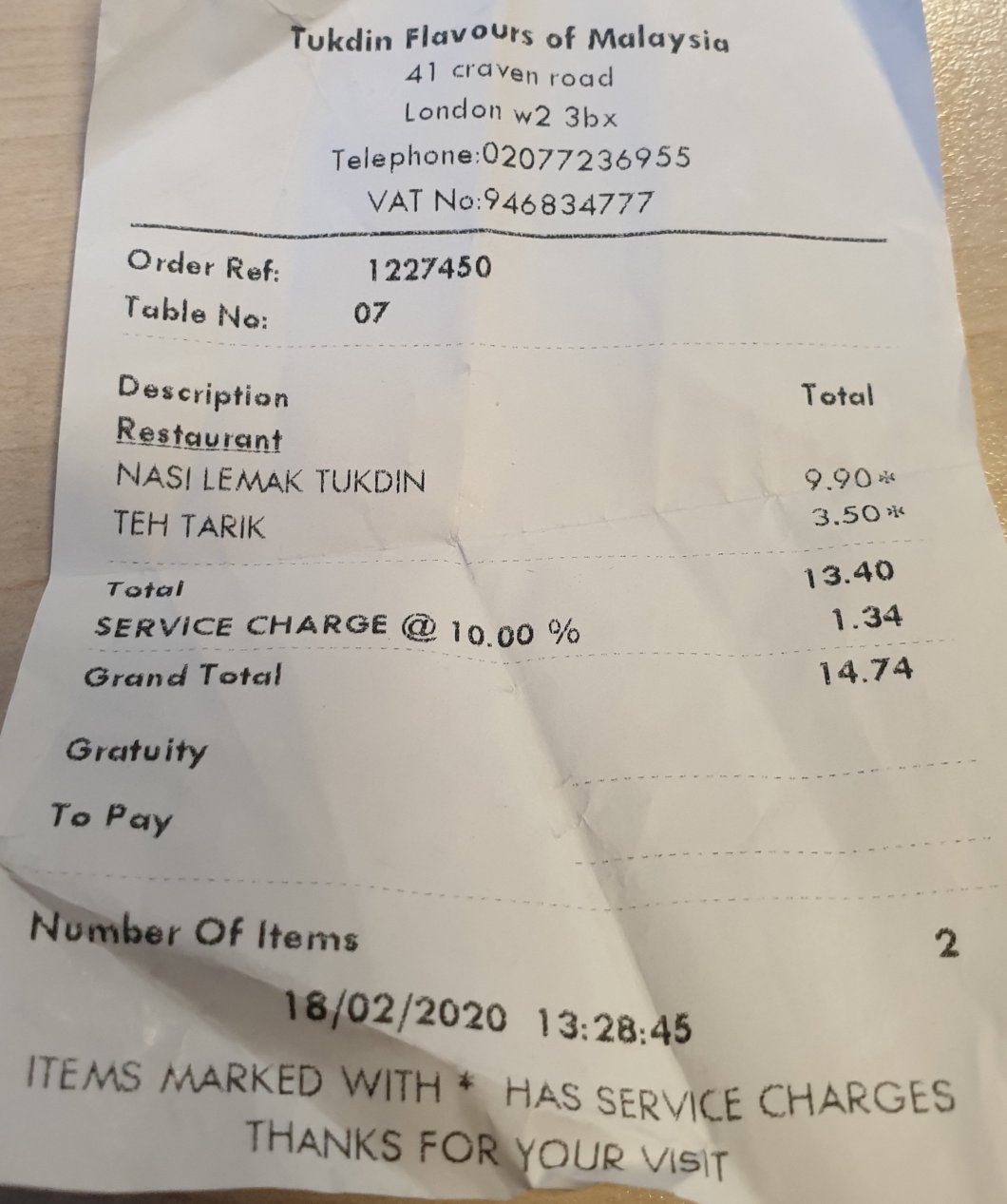 10% was added on as service charge (which I find a bit irritating especially as the bill had a further gratuity option, but it is all very clear on menu that they will be adding to so ….) to make the total bill £14.34.