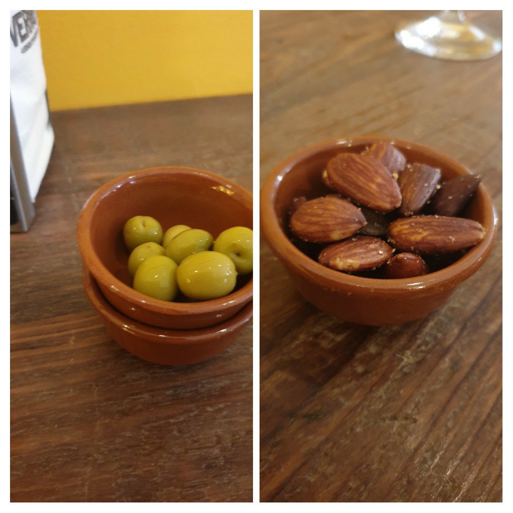 Some lovely manzanilla (I think) olives with the first round and some fine salted Valencian almonds with the second. Perfect bar snacks these.