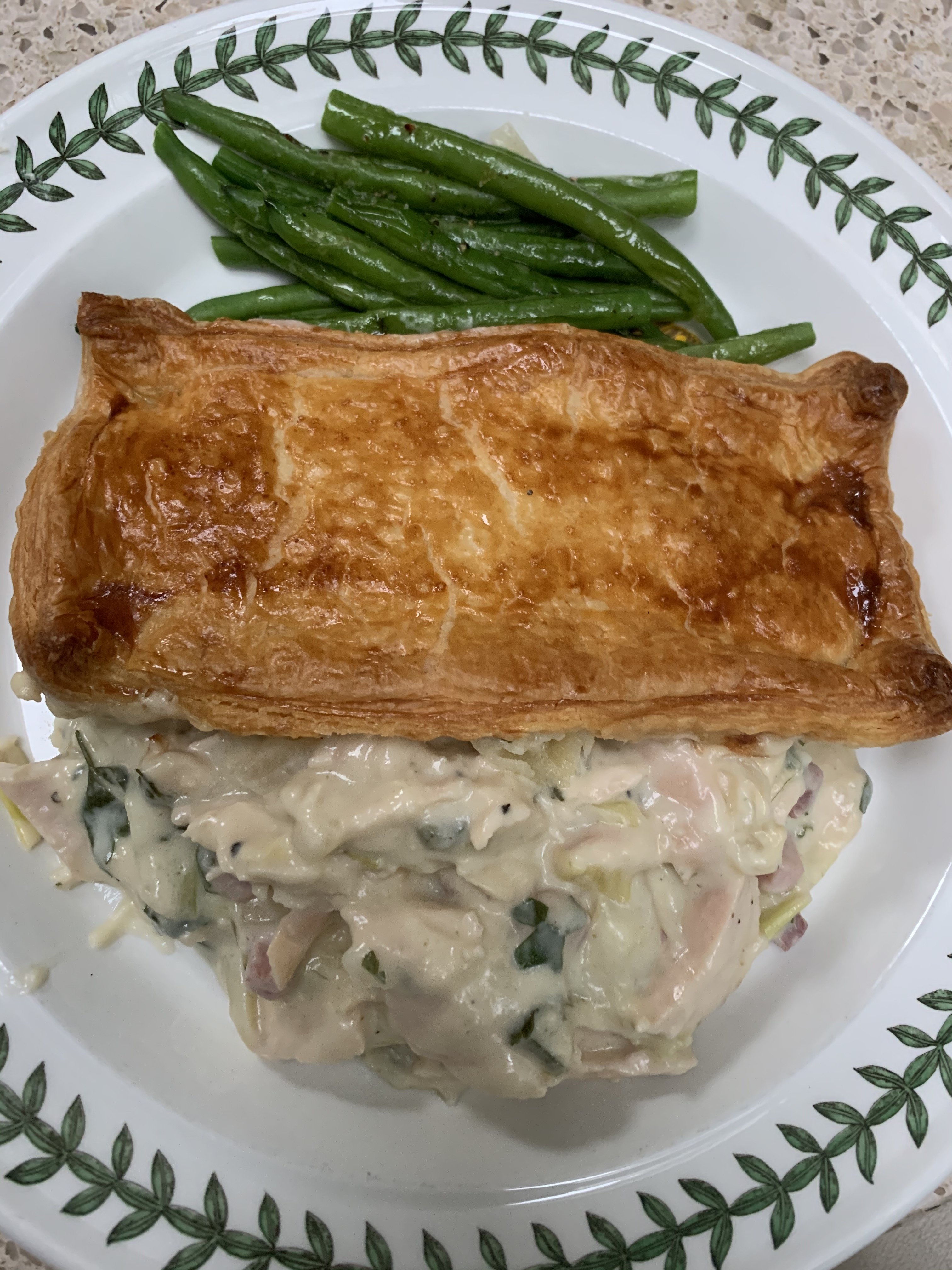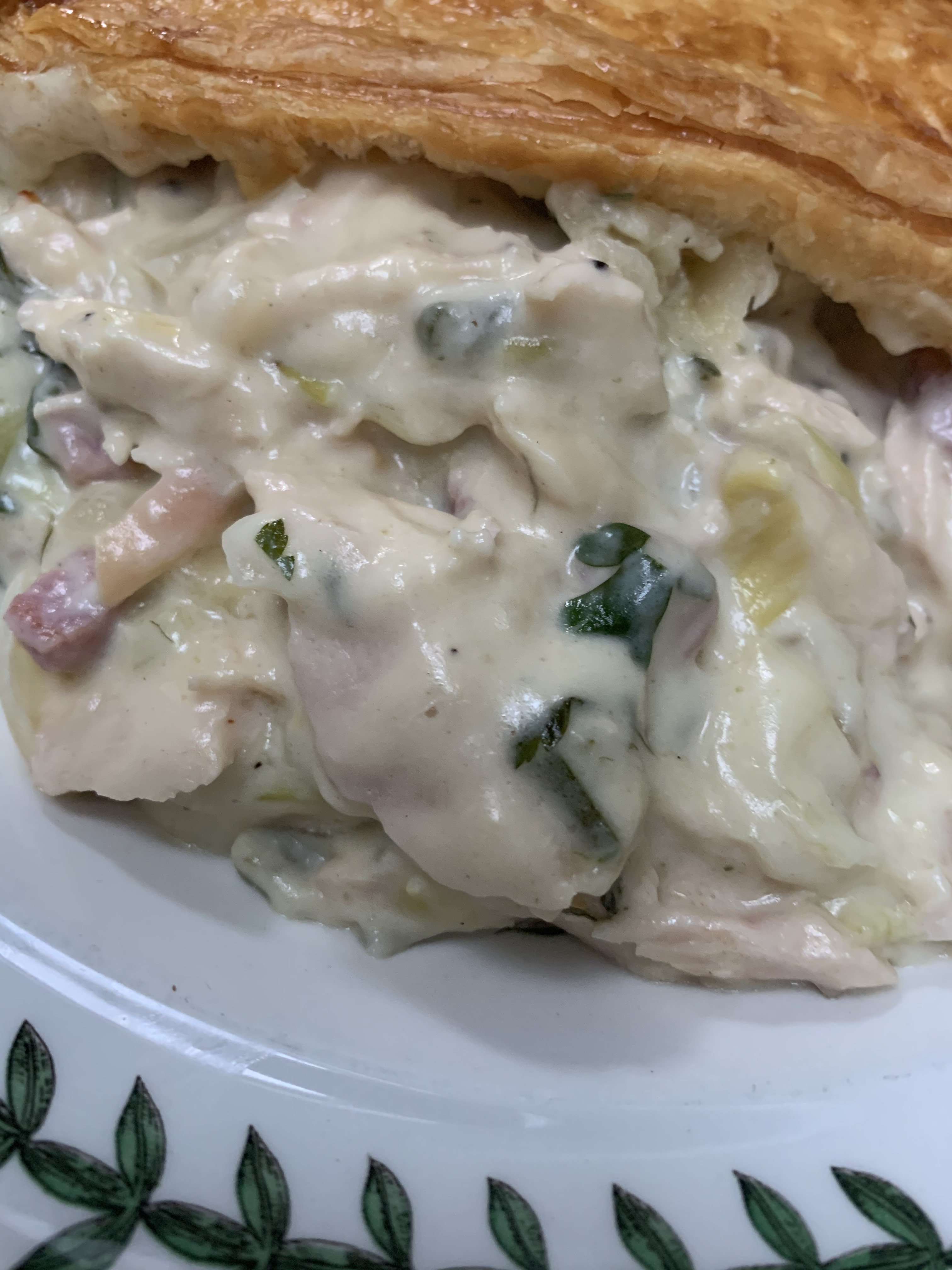 Lots of chunks of tender chicken and lardons of bacon in their (can’t abide a meat pie which is all sauce and minimal meat).Leeks, herbs and a rich creamy sauce made for an excellent filling for this pie (not a pie). Very satistying, hearty, flavour packed fare.