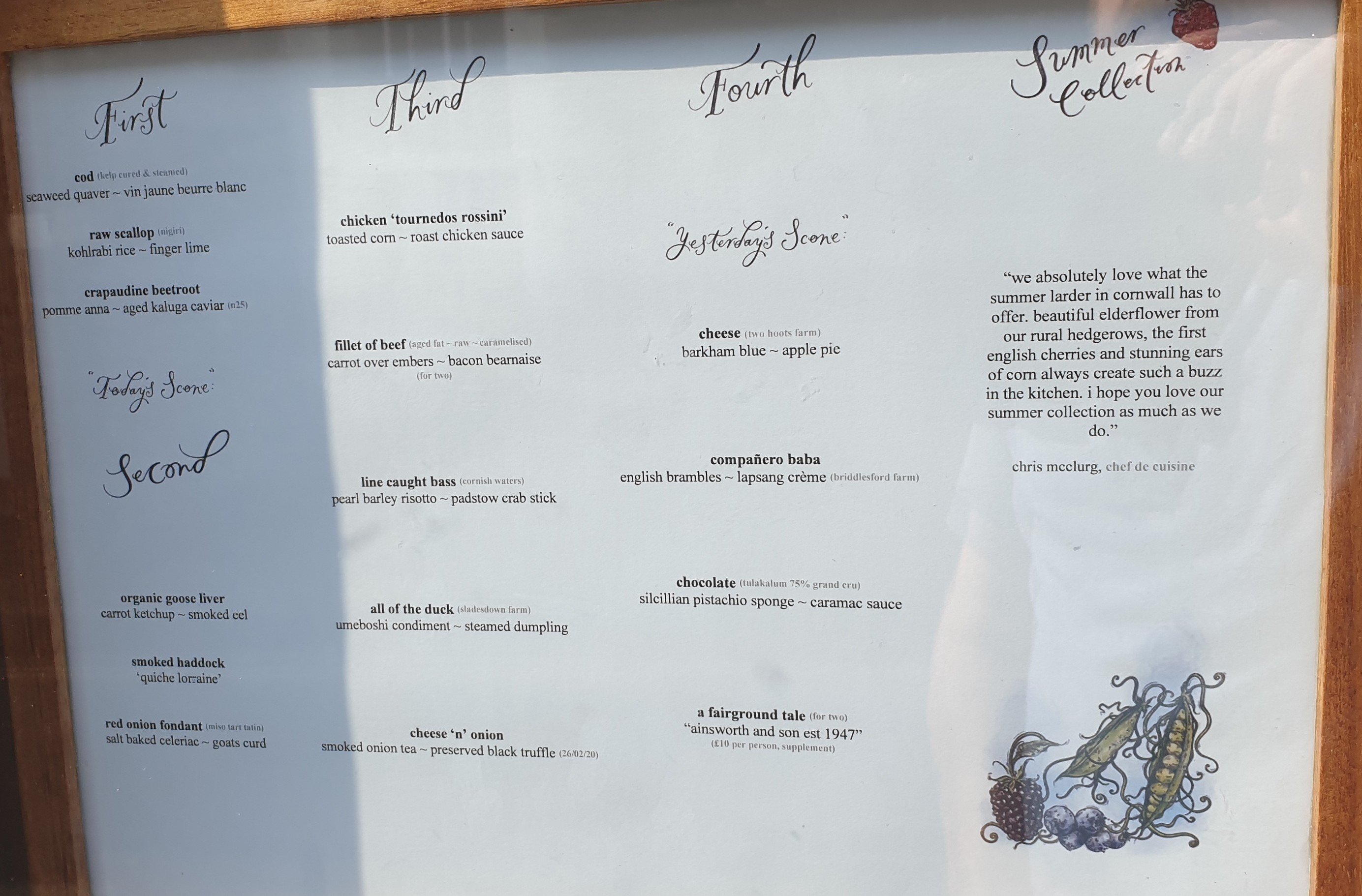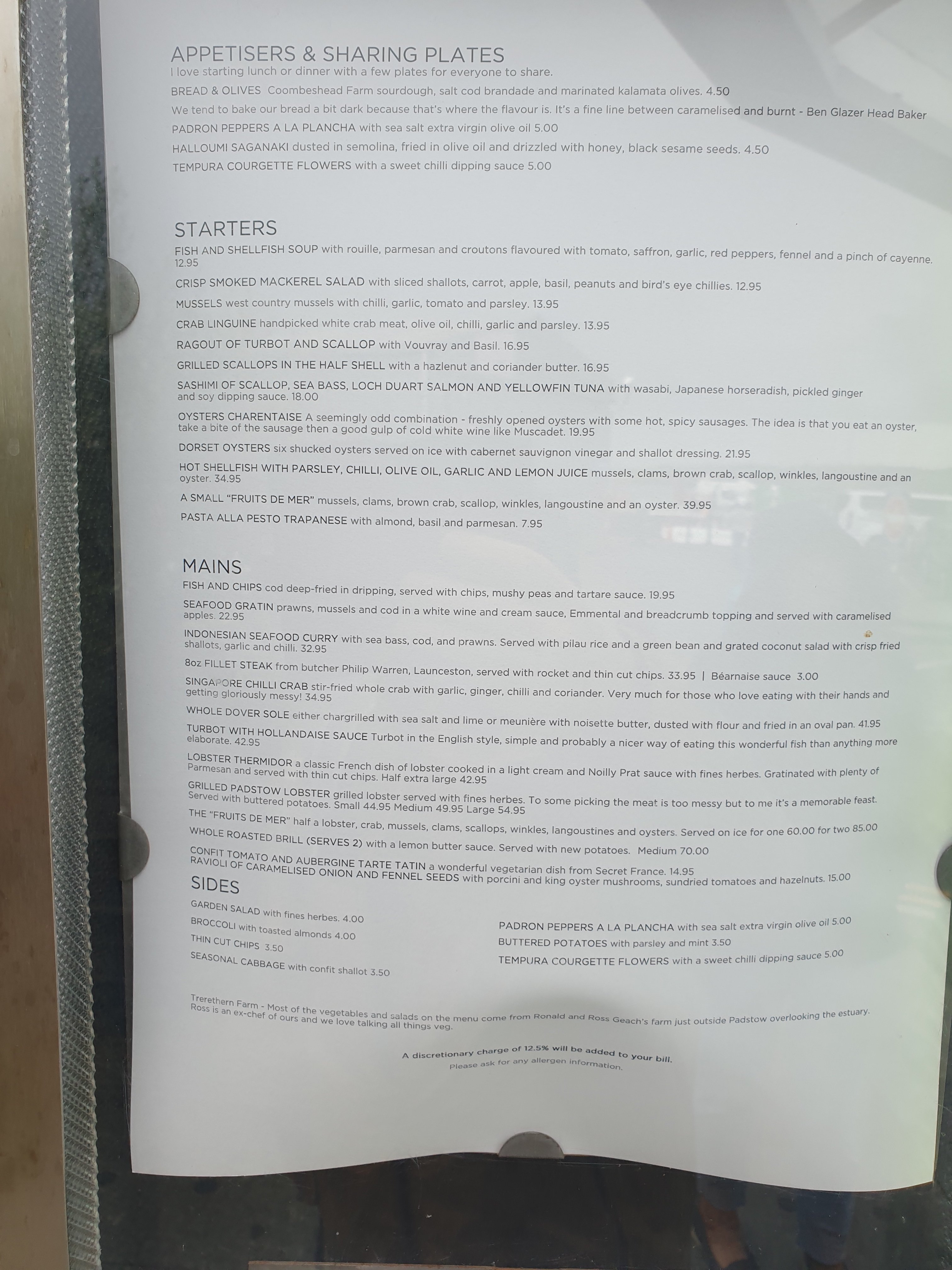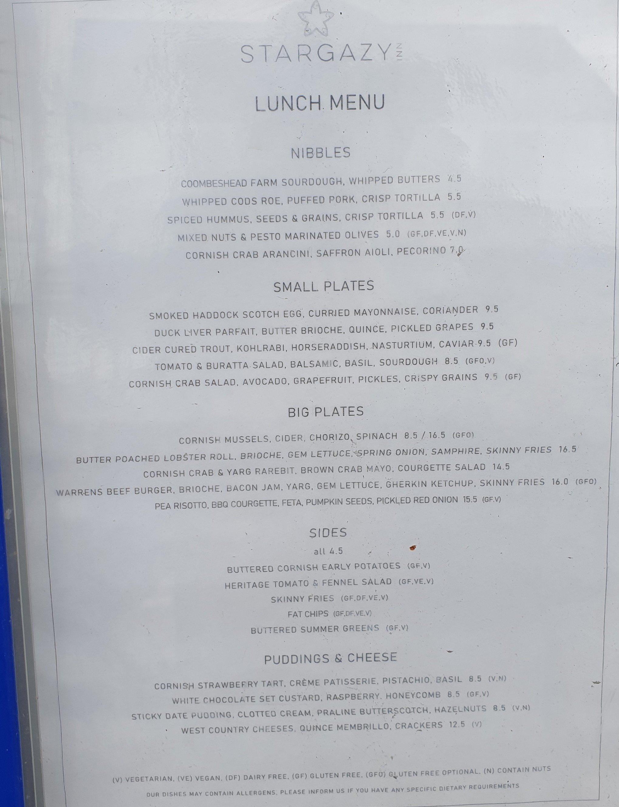 This does somewhat restricts the eating options and means the high end places (Stein’s Seafood restaurant, Paul Ainsworth’s No.6 and Nathan Outlaw’s two gaffs in Port Isaac) were off limits.
