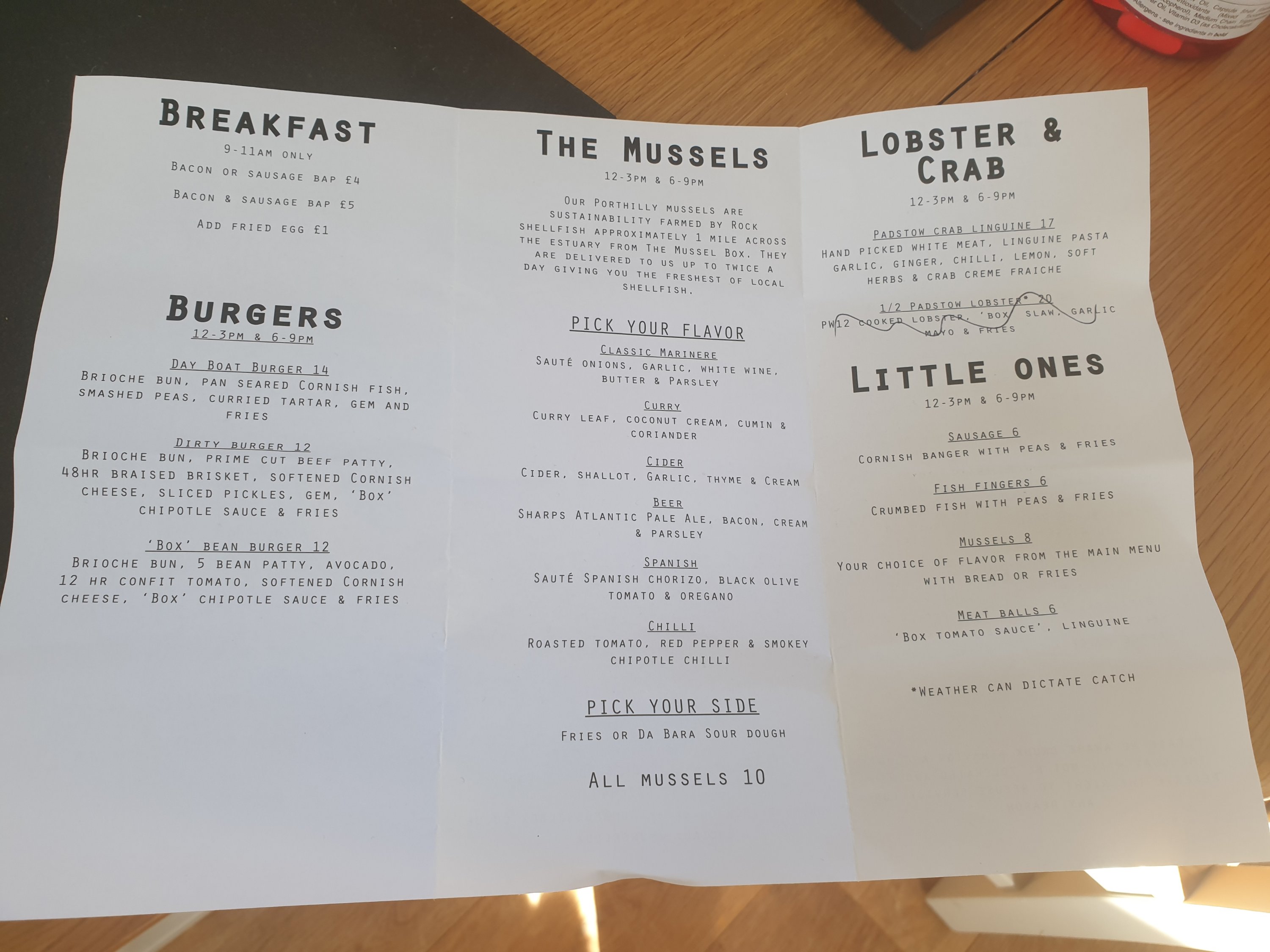 I had a hankering for the Padstow crab rolls, but alas each time we asked they were off the menu (good excuse, not that I need one, to go back methinks)A hook up with the next door Mussel Box means if you want something more substantial you can get a takeaway from the Mussel Box (next door) and eat it in Bin Two for £5 charge.