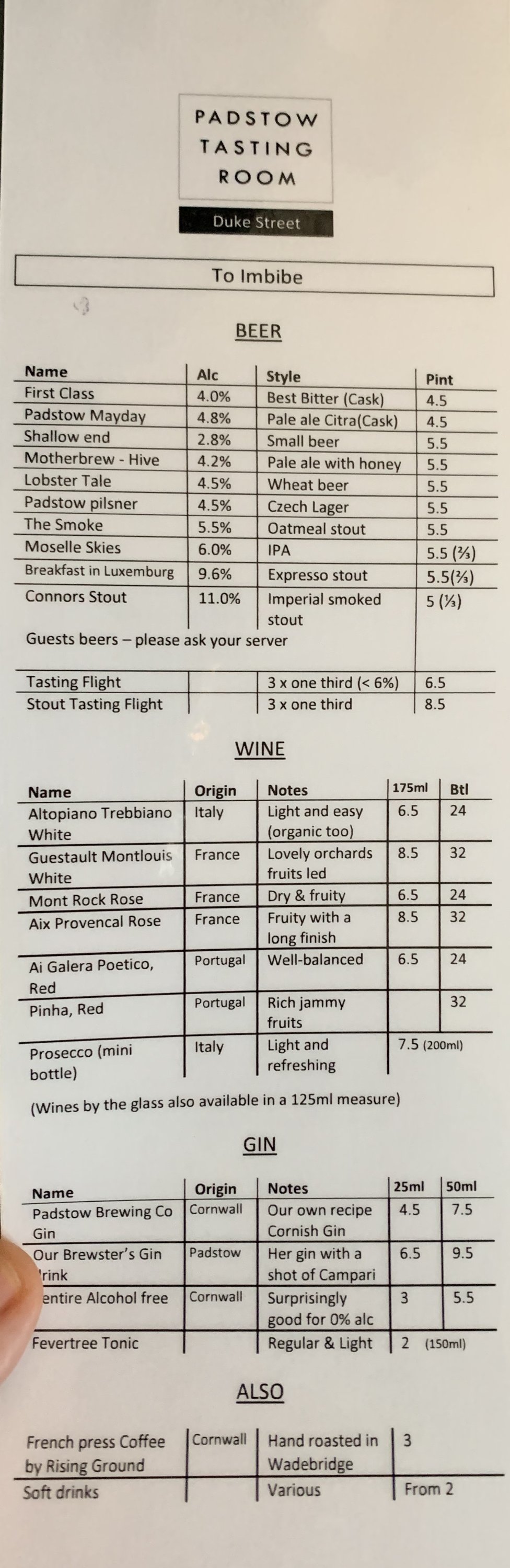 On this basis, the Padstow Tasting Room (serving beers and gins from the Padstow Brewing Company) piqued my interest, especially as they offered tasting flights.
