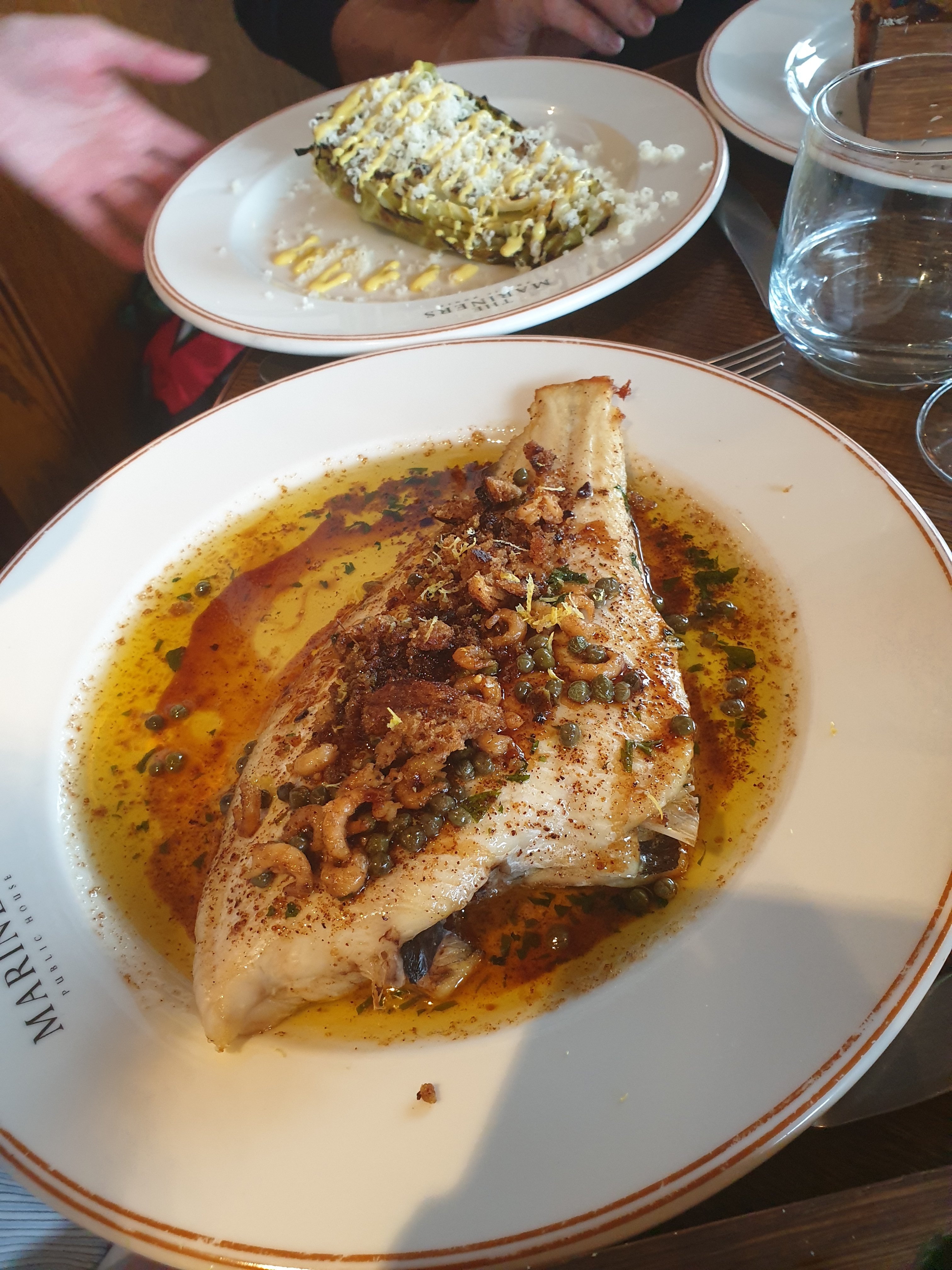 and ticked all the boxes with a great crispy batter coating, pearly white fish and proper chips, mushy peas and a cracking tartar sauce.The star of the show, however, was a gorgeous piece of plaice on the bone with brown shrimps and caper butter.