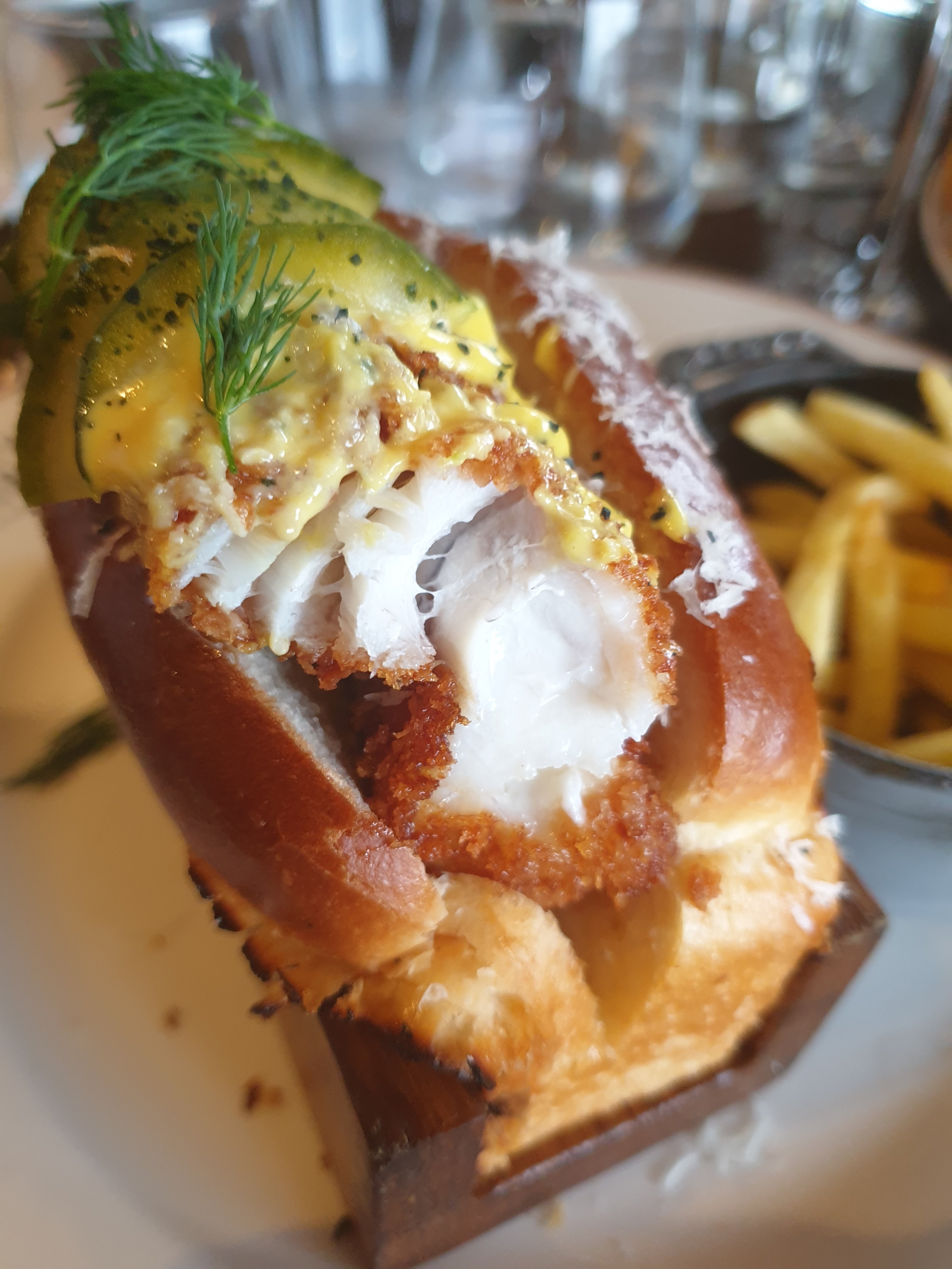 On to the mains, I had the puntastic “Dog’s Pollock” (billed as a fish hot dog, but in reality a fish finger sarnie albeit a very fat and very superior one – £17).