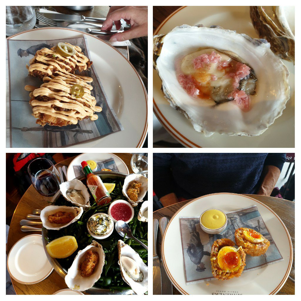 this is a great lunch spot.Starters included a scotch egg with tabasco mayo (amazing apparently – £7), exemplary fried chicken (£7.50) and some zingingly fresh oysters (from Porthilly beach which is a mere 500 yards from the place) with all the accoutrements (touch pricey, perhaps, at £12.50 for 3 raw and £13.50 for 3 fried, but very nice).