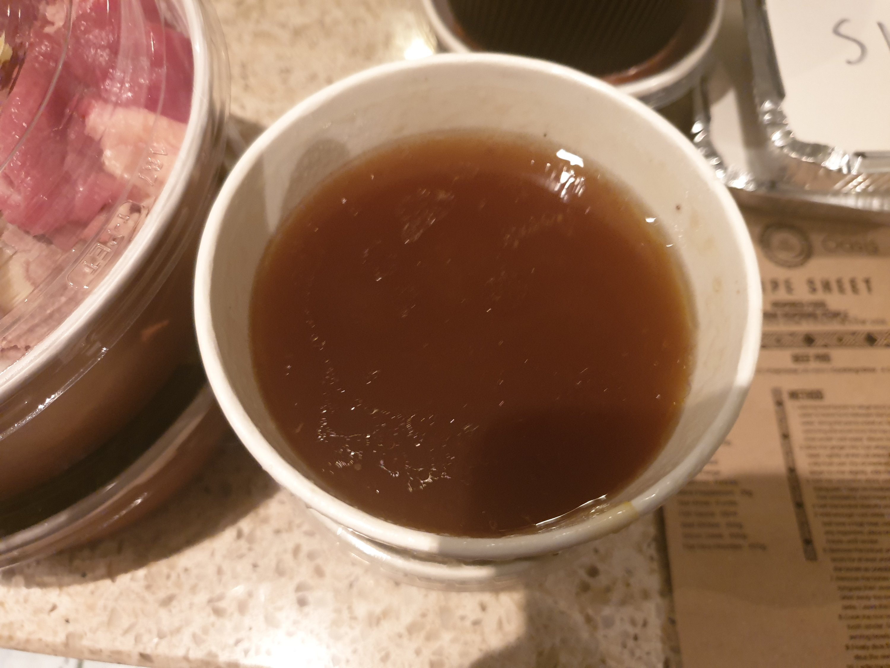 The noodles and veggies had been pre – cooked, as had the brisket, so it was a case of pouring the reheated stock into bowl and adding the aromatics.I went the whole hog with the dia rau song, but you can put as much or as little of it in as you like. The beef sirloin slices were (correctly) raw, so the idea is they are cooked purely by the application of the hot broth.