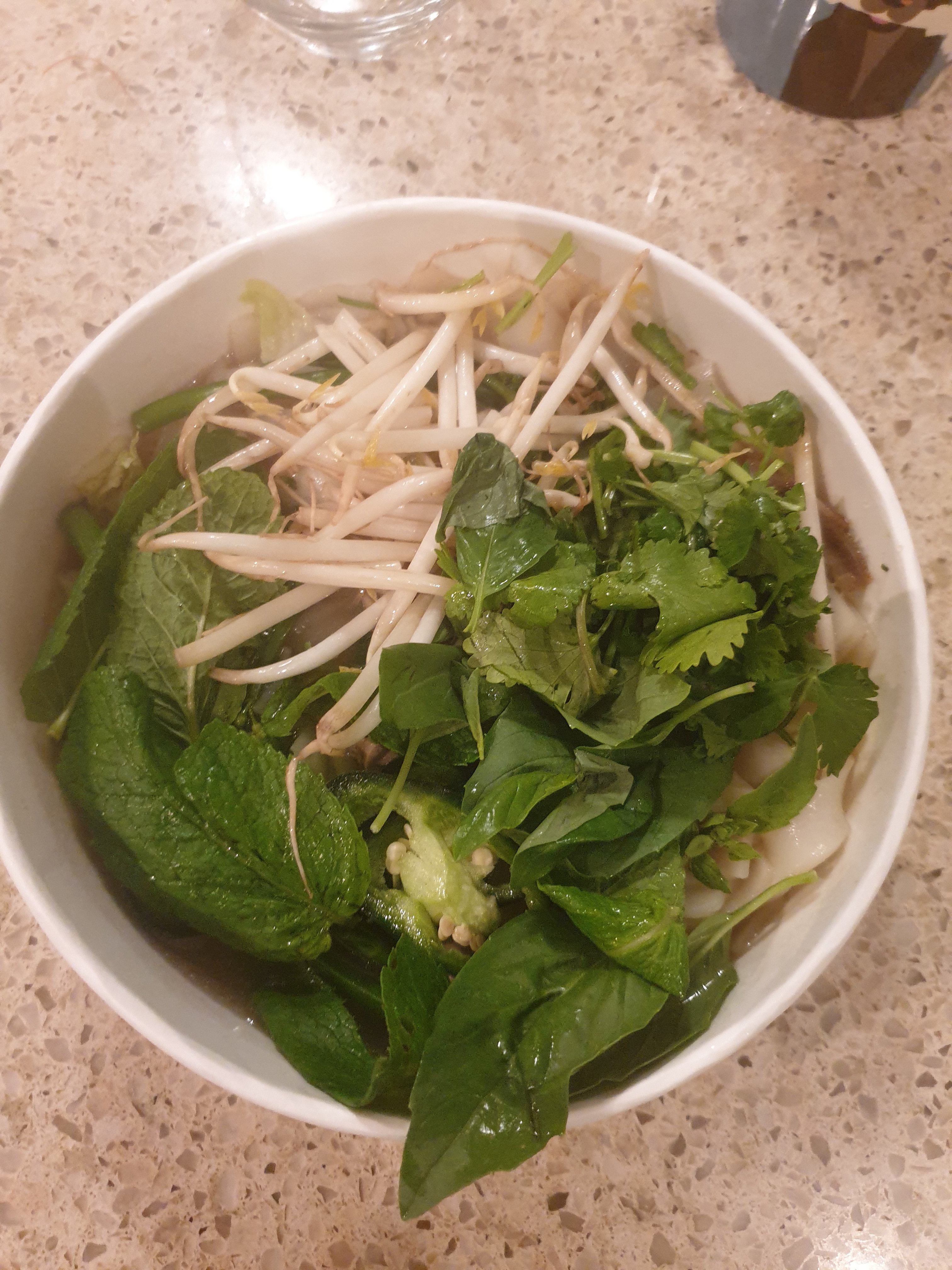 and a container of dia rau song garnish salad ( comprising of Thai basil, mint and coriander, limes, beansprouts and green chillis).