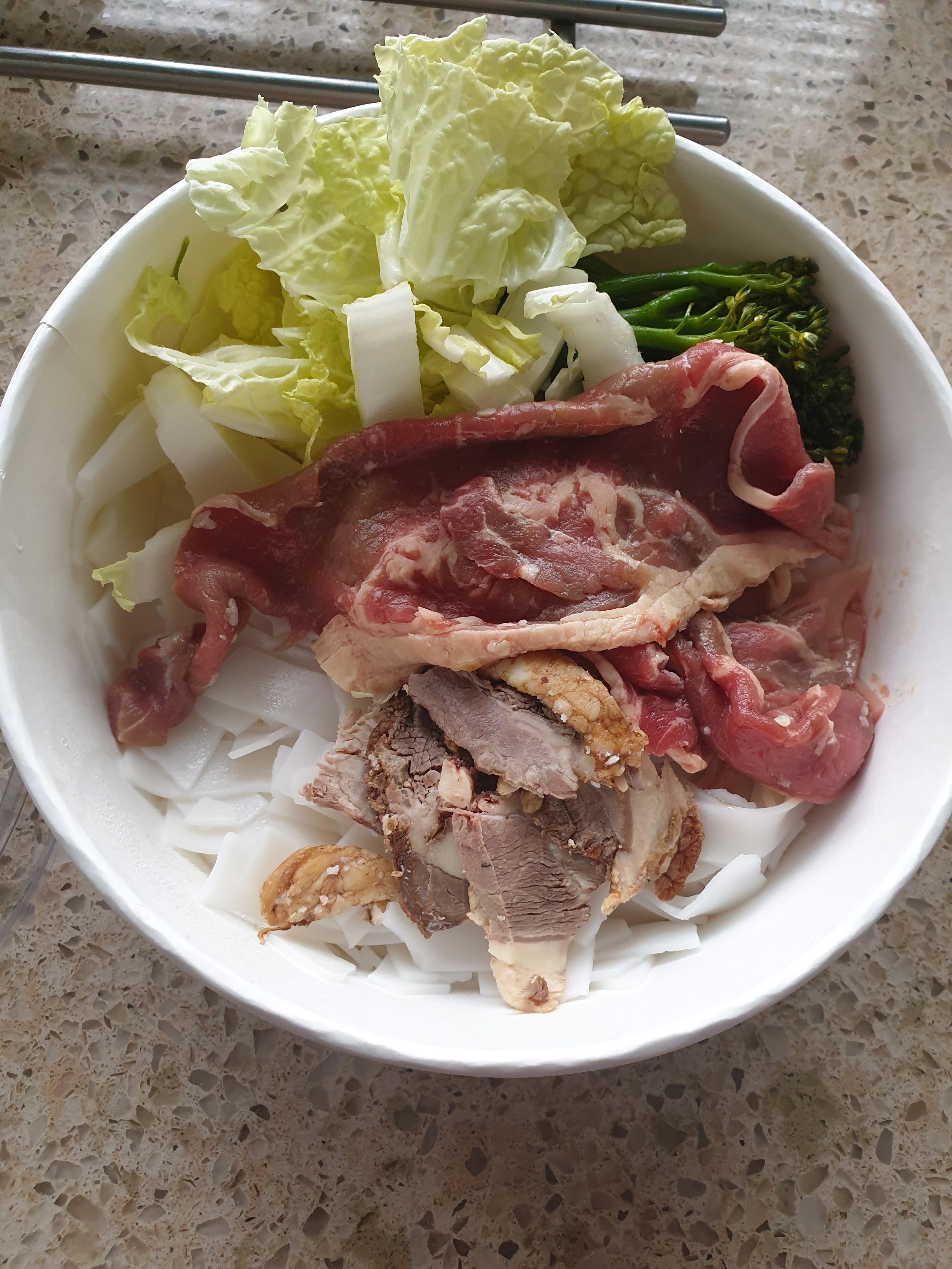 There were plenty of rice noodle (pre cooked and re-invigorated by the beef broth), as well as crunchy cabbage and tenderstem broccoli