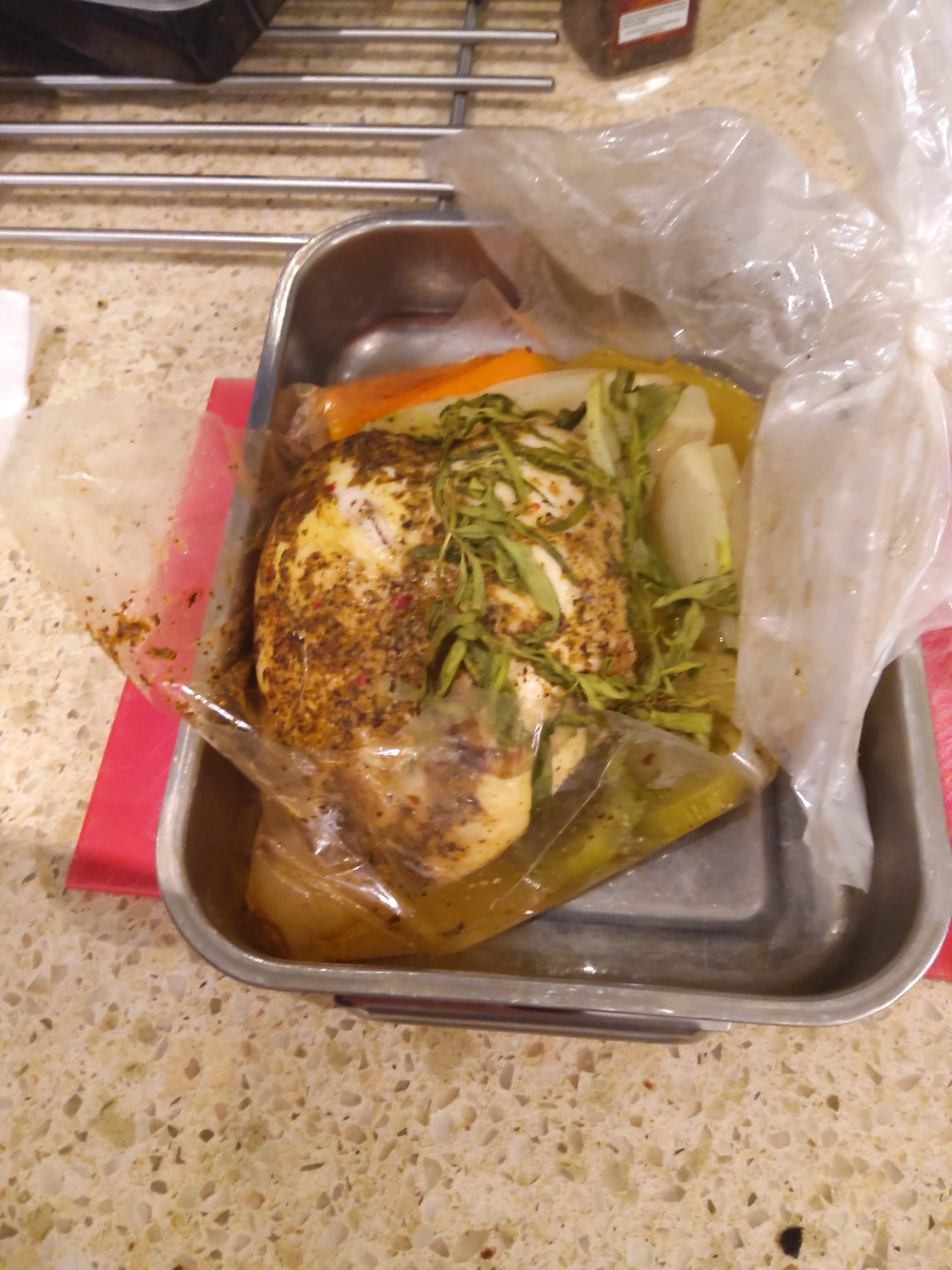 An easy to deal with roast in the bag number (I double checked this as the implications of being wrong would have been pretty horrific), with veggies, tarragon and copious amounts of butter in the bag.