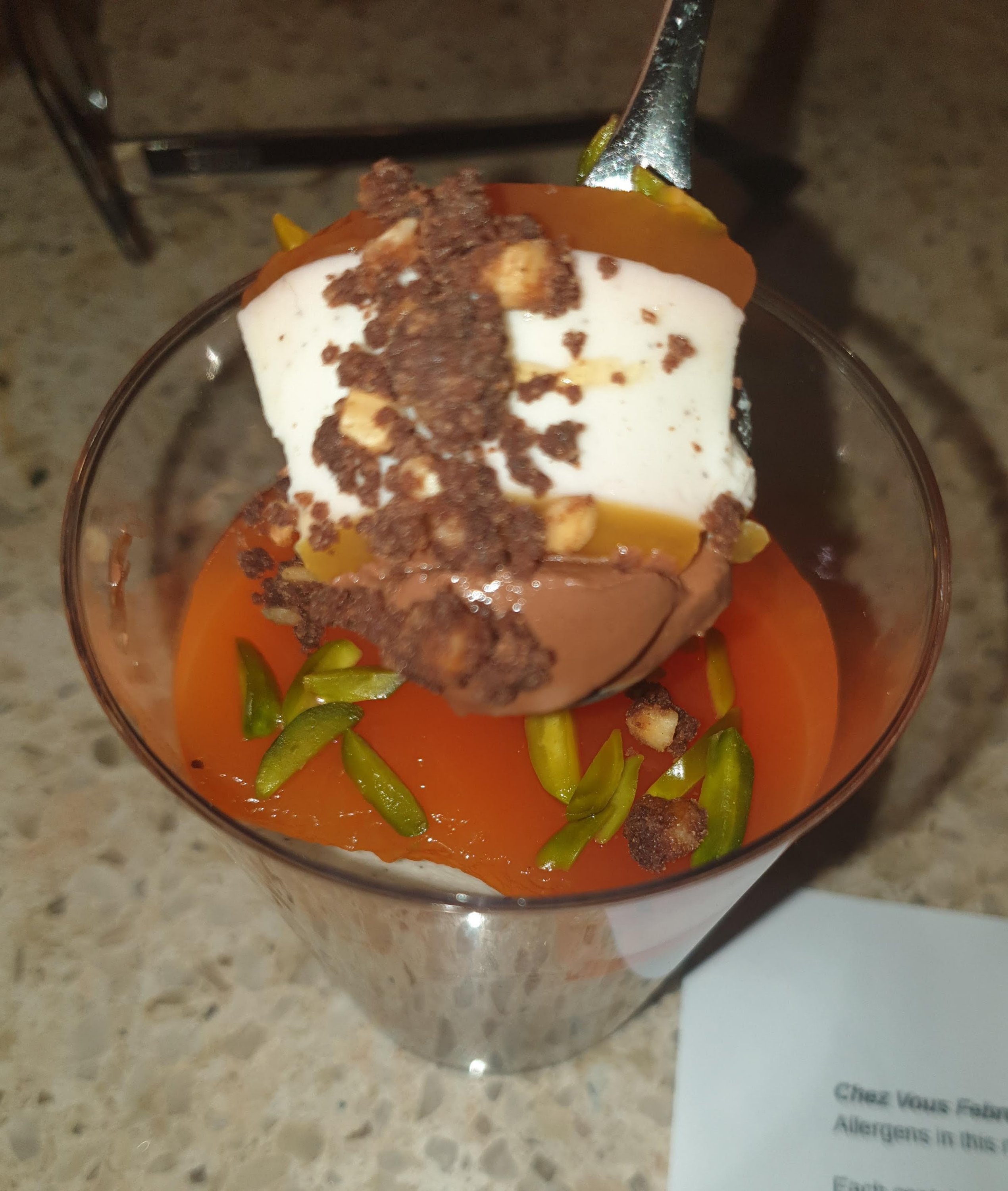 The pudding was another triumph with a seeming cacophony of flavours achieving a harmonious balance – a very jazzy dessert.Rich chocolate was cut by sharp blood orange and ever so slightly sour coconut infused yoghurt.The instruction to sprinkle the cocoa and hazelnut crumb on each spoonful brough a nice nutty flavour and a touch of bitterness to proceeding, as well as a welcome textural contrast.  Very clever stuff.