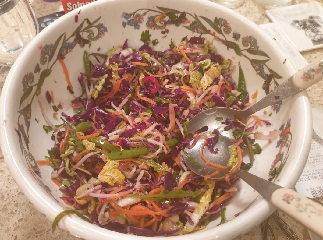 The crunchy freshness of this salad, with a touch of heat, worked very well as against the slightly sweet richness of the pork (less so as against my freedom seeking wisdom tooth).