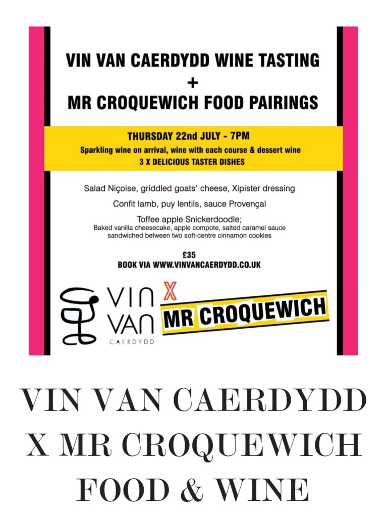 A fab looking menu from Mr. Croquewich, which I knew would be good based on the quality of their lockdown bistro menu, and 4 glasses of wine (including a glass of fizz) from Vin Van Caerdydd (which I knew had a pretty good list).