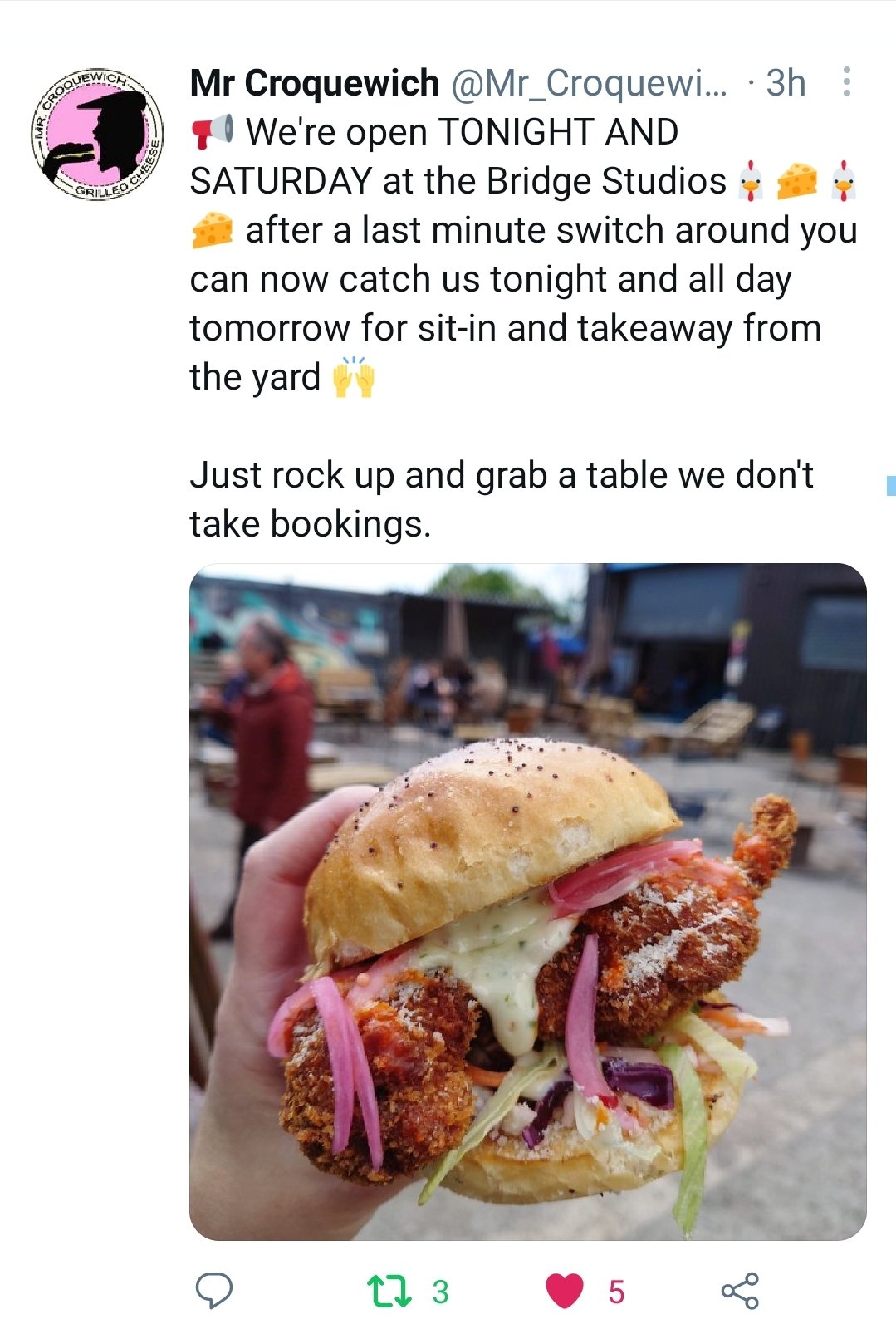 It is also worth noting that you can go down to Bridge Street Studios for food (some great chicken burgers from Mr. Croquewich),