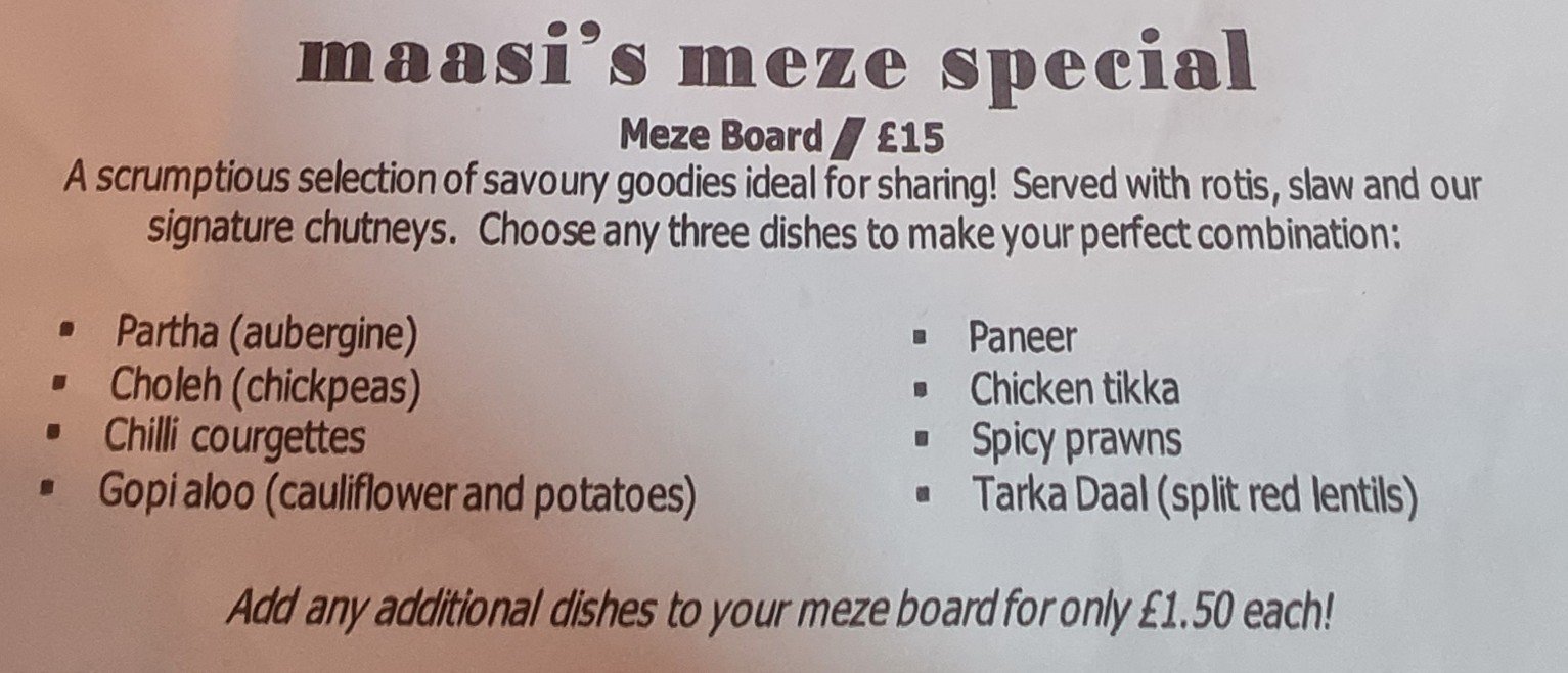 I toying with the rather fine sounding Maasi’s meze, for a seemingly very reasonable £15 for 2, with the ability to load up with extra items for a mere £1.50 a pop.