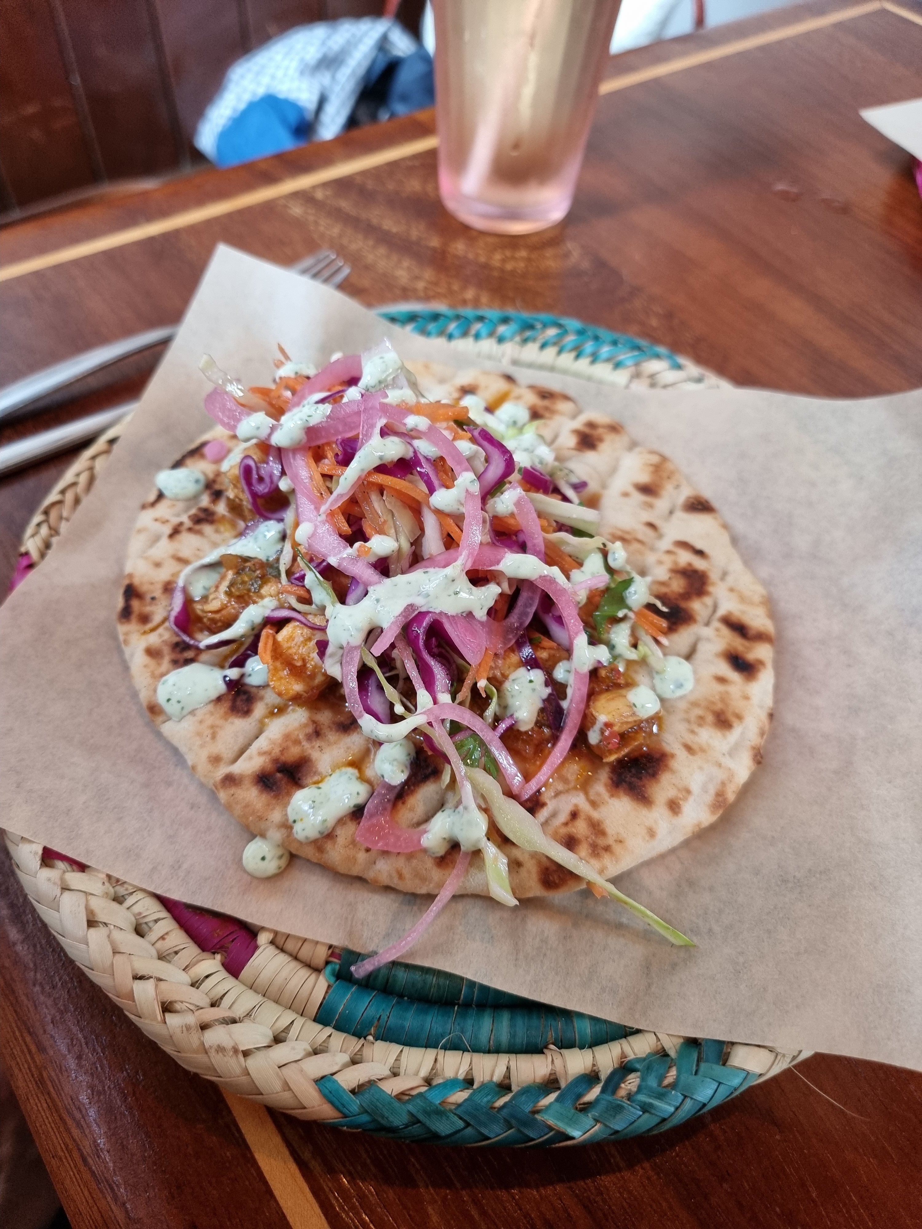 A pillowy naan was the base for some lovely flavours. Spicy (rather than hot) chicken, a really zingy raw slaw, a coriander and chilli chutney and a tangy yoghurt dressing made for a grand lunch time/brunch dish.