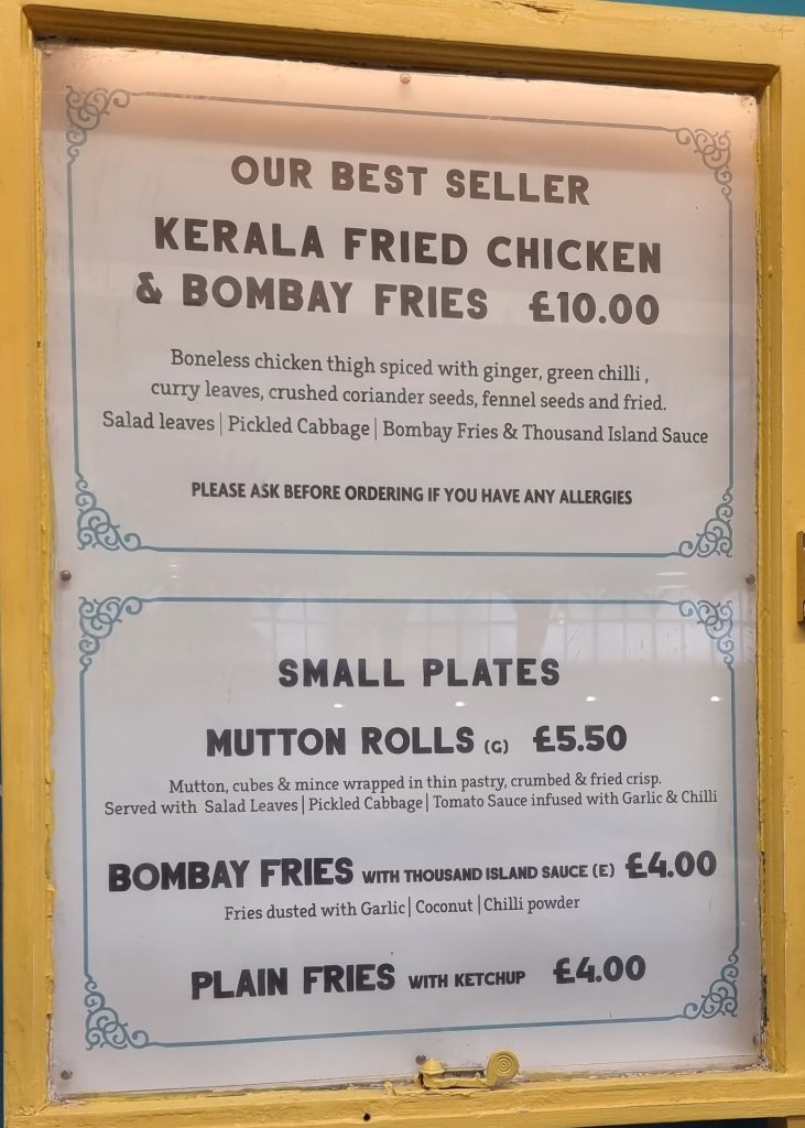 The menu is short, but rather on the enticing side, with their signature Keralan twist on fried chicken and chips, as well as mutton rolls,