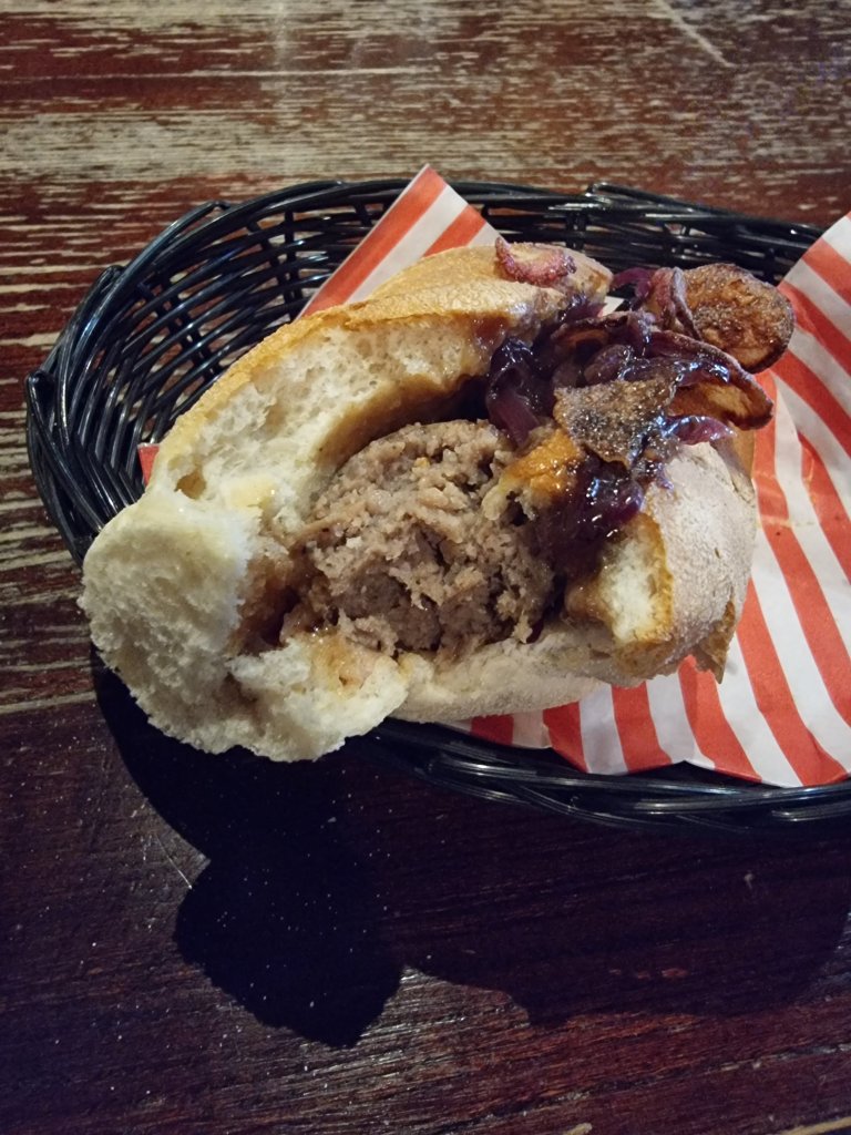 The sausage sarnie/bap, when it arrived, was a beefy specimen (if not much of a looker – bit of a 50 shades of brown vibe to it).