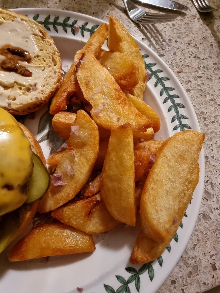 Not quite as crispy as my triple cooked chips, but I am bias (I personally think keeping the skin on makes for a less crispy chip),