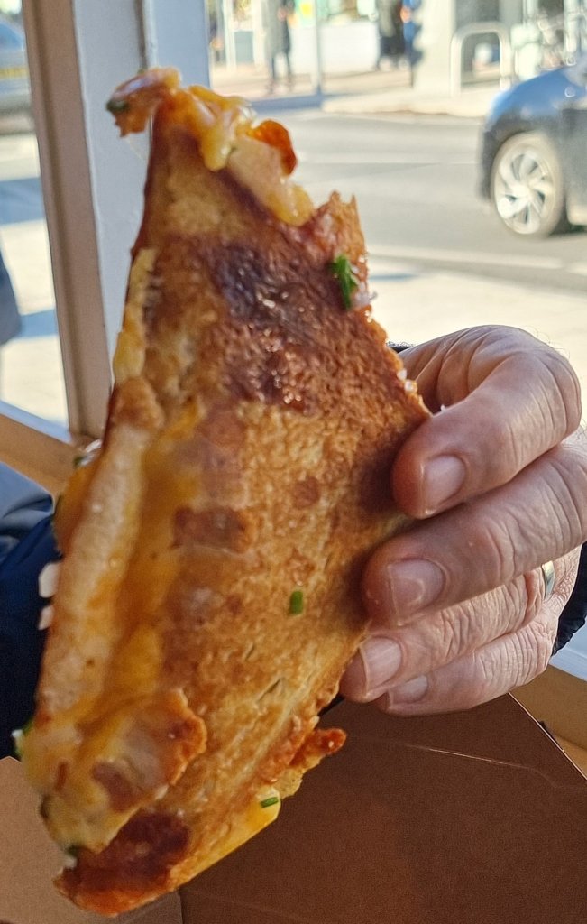 Good quality ham (of the non plastic variety) worked well with the oozing house blend cheese mix. Assuming cheddar and mozzeralla in the blend in terms of the cheese element, but definitely something else in there. Couldn’t tell you what, as the blend is a secret apparently. Whatever it was it gives the cheese a lovely viscoscity, akin to molten lava,