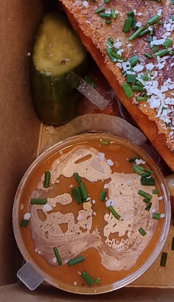 As the sarnie was pretty rich, to me the best foil for it would have been something acidic that would cut that richness. The lovely pickle worked very well in that role, but I question what the marinara sauce brought to the party.