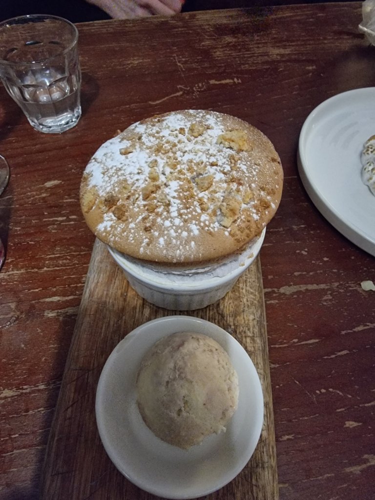 We decided to share, with J veto’ing one on basis that it (the buttermilk pudding) triggered her wobble phobia 🤷♂️. We thus settled on the souffle and the baked alaska (both a tenner) between the 3 of us.