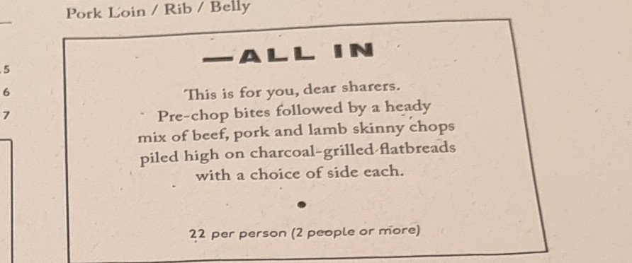 Prior to my arrival I had had a cheeky peek at the menu and was rather disheartened that the “All in” was stated to be for a minimum of two.