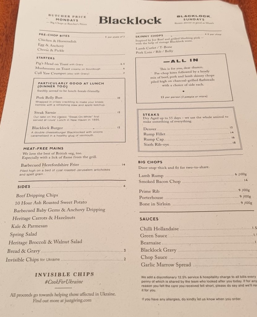 This left me in a quandary, but I have wanted to try Blacklock for a while and noticed that their site in Soho was walkable from where my last meeting concluded. A perfect opportunity to give their Great Windmill Street site a whirl I thought.