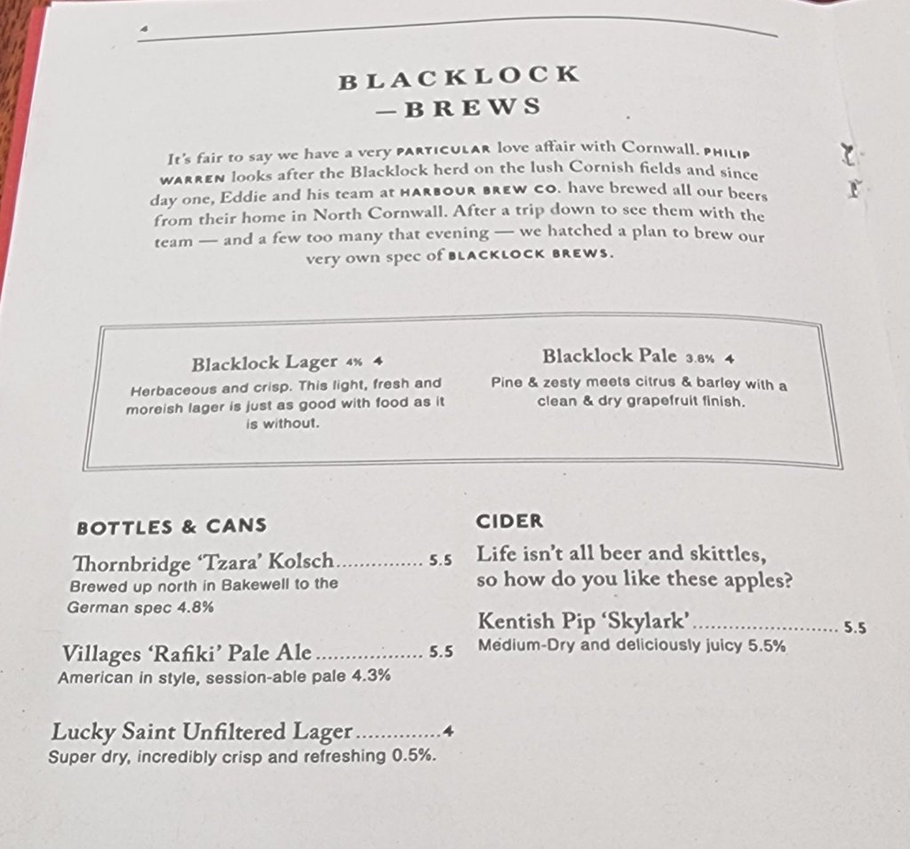 On the booze front they have a reputation for their cocktails, which are seemingly very nicely priced at between £6.50 (negroni) and £8 (white port cobbler), with plenty of choice.