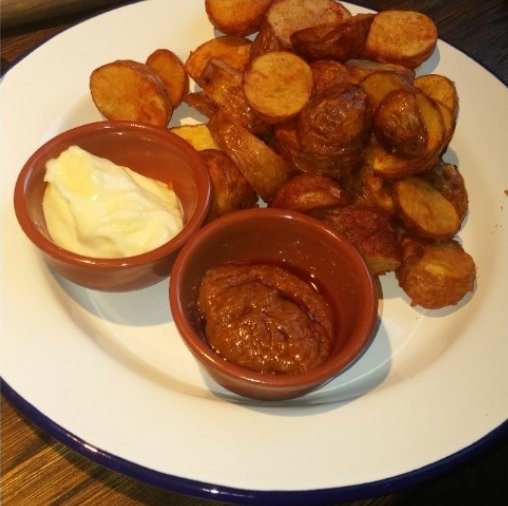 Decent brava sauce with a pleasing bit of piquancy and chunks of chorizo. Personally I prefer my brava sauce a bit looser and the potatoes a bit crisper.