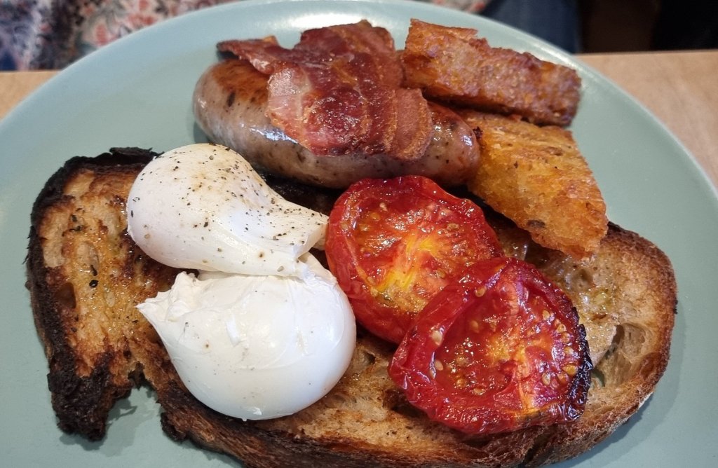 Good looking plate this, with it getting the thumbs up from Mrs. SF (never one to be easily pleased in my experience). Everything was pretty much cooked on point with non flabby, but not nuked, back bacon (smoked, which is not Mrs. SF’s preference but she said it was a light smoke so she was happy enough) and a girthy banger with no sign of filler in the mix. The poached eggs had a suitably runny core, with none of the off putting white goo, and the tomatoes had a nice caramelisation to them (bane of a breakfast plate is an underdone tom).