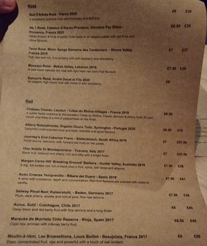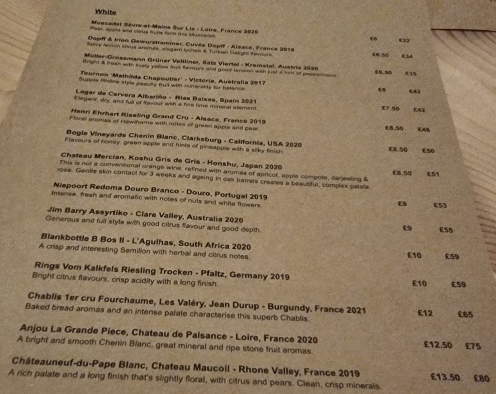 • Needs more sherry/Montilla-Moriles wines on the list (I could put together an absolutely killer pairing of these with this menu) and don’t just dump them in with the sweeties – sherry and MM wines are proper food wines, with loads that would work very well with the savoury elements on the menu here.