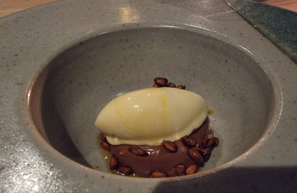 To be honest can’t tell you much about it, as I wasn’t really concentrating when they said what it was, bar from the chocolate mousse being silky and rich and infused with orange, the toasted grains being very reminiscent of sugar puffs and the ice cream a sour cream number (I thing) with miso caramel. It was blooming nice is all I can really say.