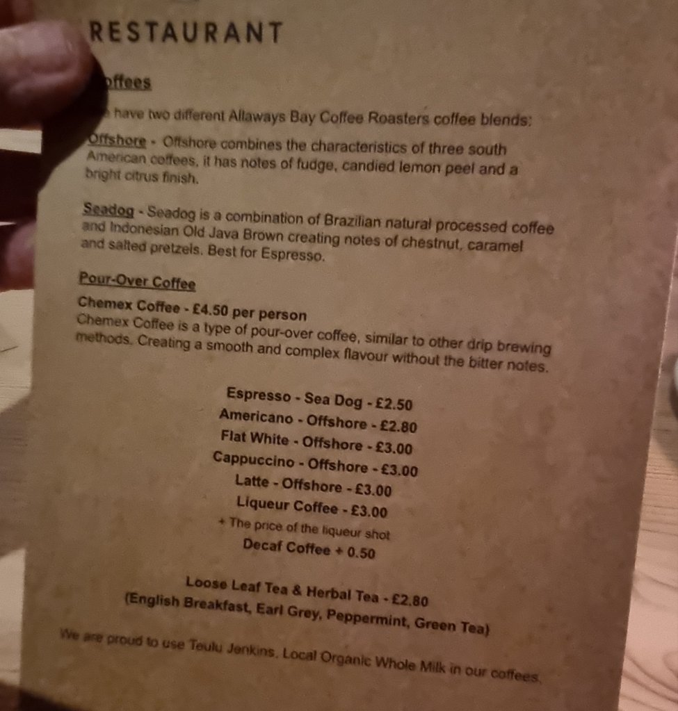 We both has a seadog espresso (Ā£2.50 each is not bad at all for the quality – tasted exactly as dscribed) and very nice (again forgot to take pic) it was too.