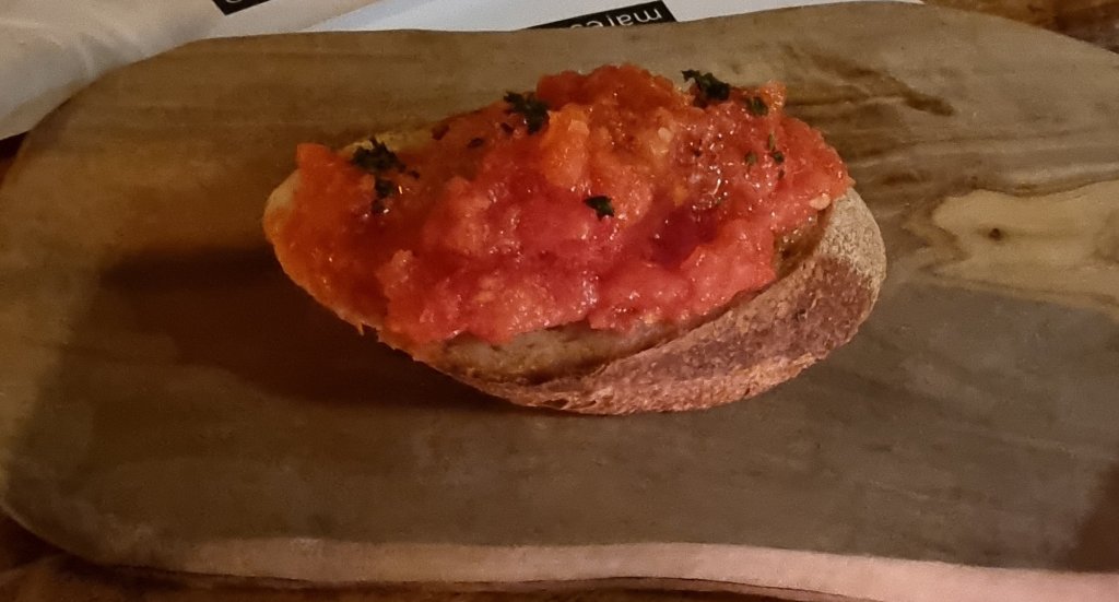 Proceedings (before I arrived, due to a Reginald Perrin “15 minutes late, badger gnawed the junction box at Swindon“, believe it or Didcot“😄, late running train/mobile torture chamber with those GWR concrete seats) started off with some rather nice pan con tomate (£4.5 for 2). Such a simple dish, which can be as dull as dishwasher if the ingredients are not top notch.