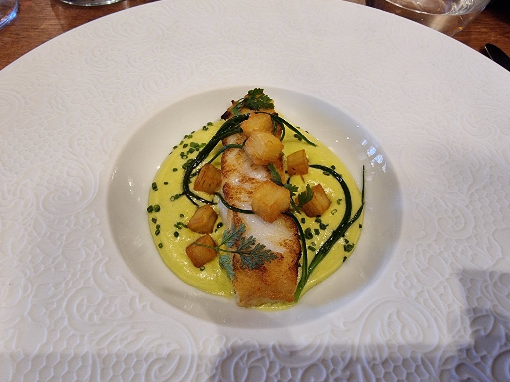 with “a point” cooked fish. A nicely bronzed exterior yielded into nice thick just past translucent pearly flakes, with the merest nudge of the knife.