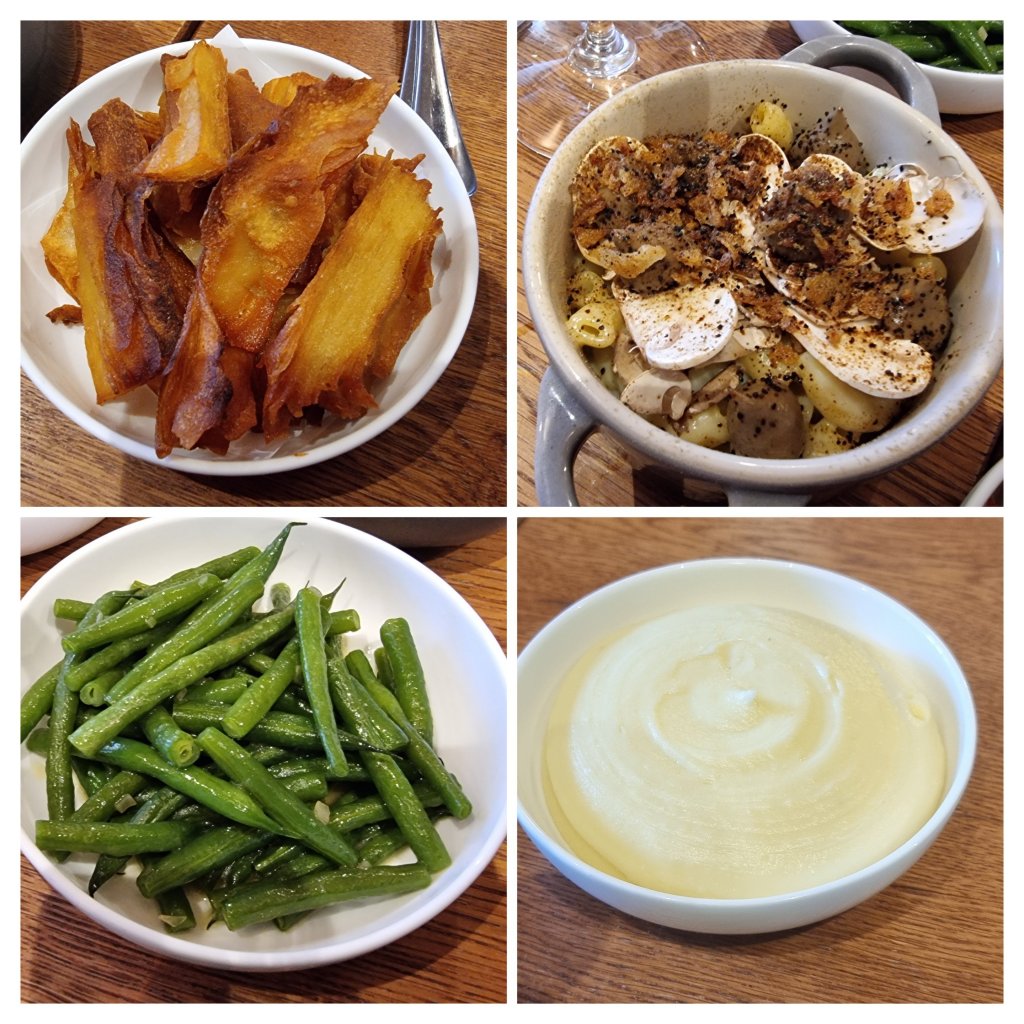 Crispy layered garlic spuds delivered admirably on the crunch, but were a touch lacking on the advertised garlic front. Puree potato was indulgent, with copious amount of butter in the mix. For me, however, it was just a touch overworked. Nice French beans (I was told I was an arse – by my fellow diners – for moaning that for £5 I expected them to be topped and tailed), but again these were lacking in much/any of certain advertised elements (almonds and confit shallots).