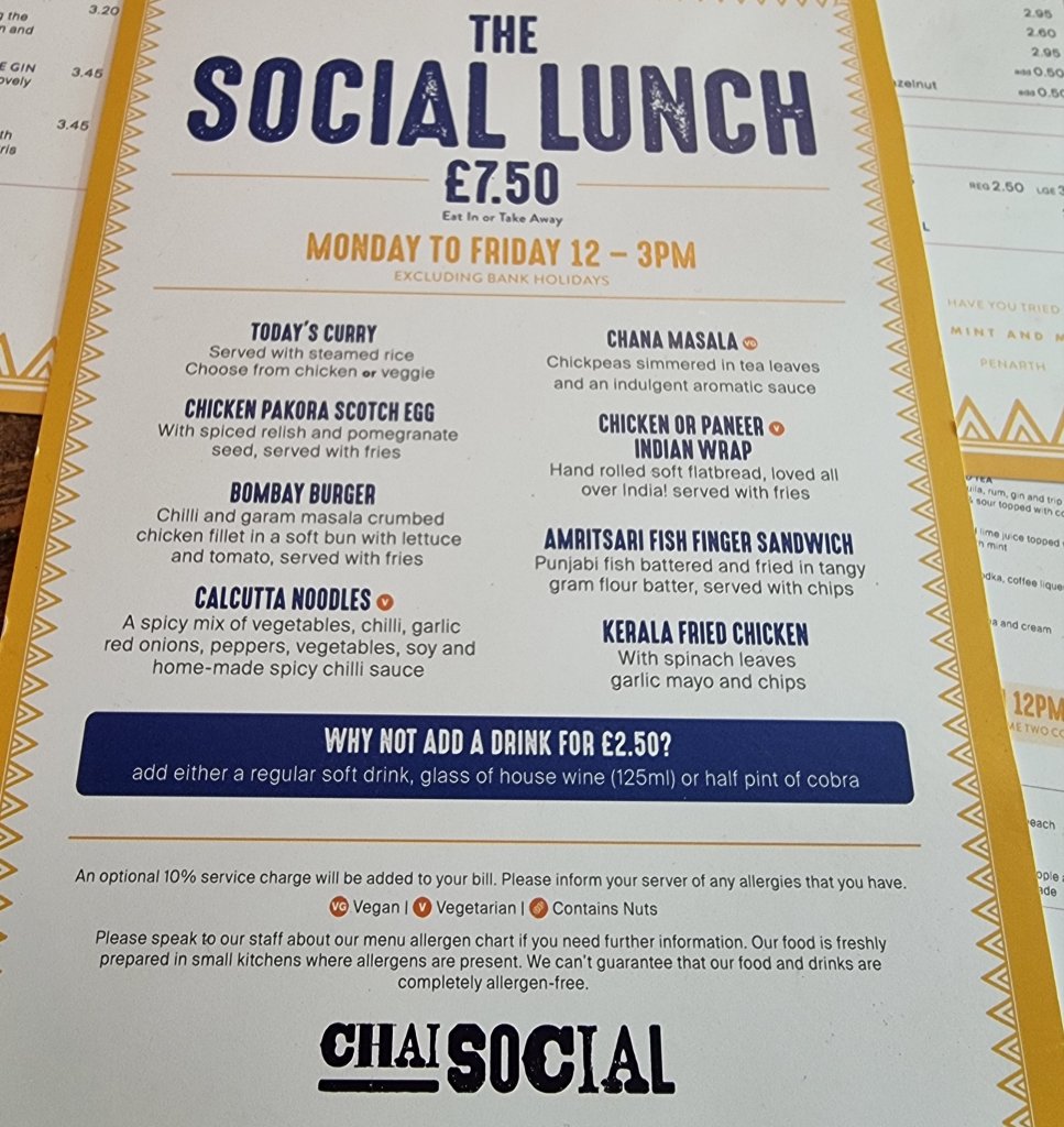 Again a minor quibble is the chai (or indeed any hot drink) is not include in the lunch offer,