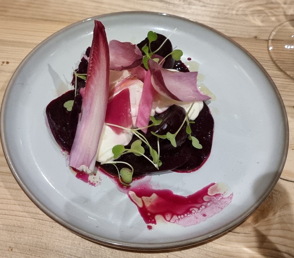 married the sweetness of the beetroot, with the bitterness of chicory and the tangy sourness of goat’s cheese curd. Definitely a dish that was greater than the sum of its parts